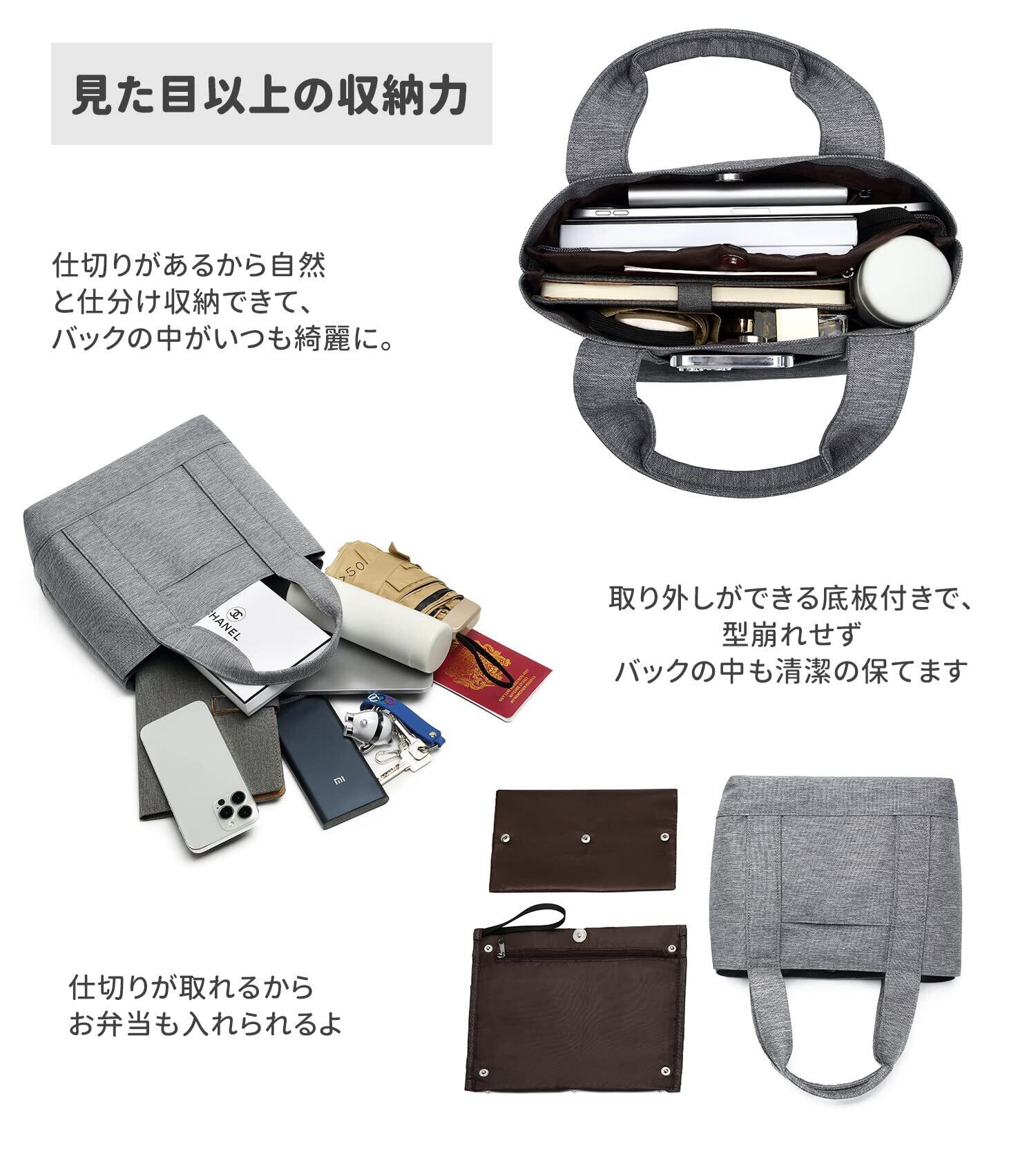 【見た目以上の収納力と機能性】コンパクトだけど収納スペースにはペットボトルが立てて収納できたり、長財布はもちろん、B5サイズノートも収納可能なレディース/メンズ トートバッグです。またお弁当箱など、かさばる荷物が多い日は仕切りを取り外して、普通のトートバッグに変身、ランチバッグにもピッタリです。さらに底板付きで多くの荷物を入れても安定して自立します。