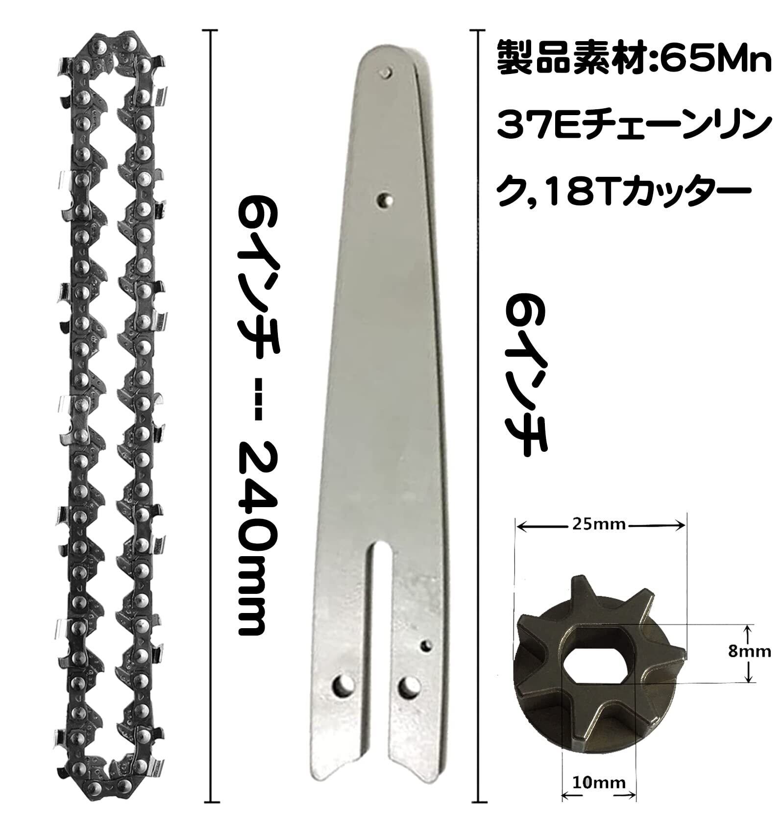 4本 ハンディチェーンソー 6インチ 替刃:電動チェーンソー 替刃 6インチ 4本付きで、チェーンをバラバラで買うより安く、予備のチェーンソー6インチ替え刃 も3本保管できるので大変便利でお買い得です。スペアとして使用できるガイドパーとスプロケットもあり、チェーンが鋭くない場合は、研ぎ棒でチェーンを研いで鋭くすることができます