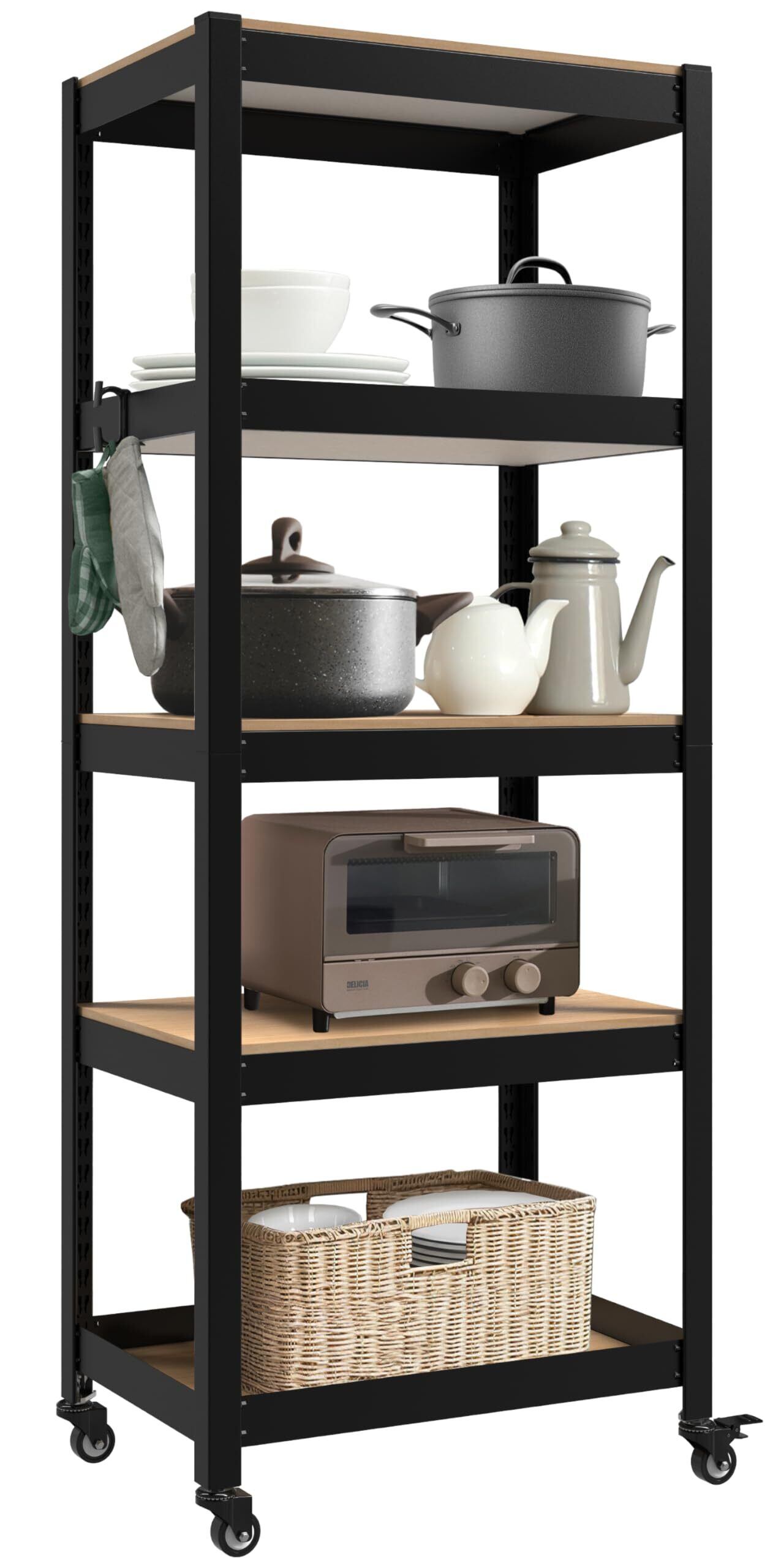 HOMEDANT House 組立簡単 ラミネート スチールラック キッチン 5段 幅60 奥行40 高さ158 ブラック キャスター付き 車輪 高さ調整可能 棚 収納棚 メタルラック 倉庫 ガラージ オフィス 業務用