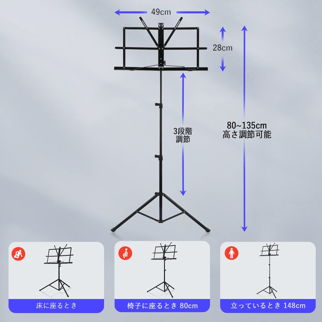 【幅広い高さ·角度調整】譜面台の高さは80cmから135cmまで自由に調整することができます。3段階の高さ調節デザインにより、どの高さに調整しても高い安定性が得られます。楽譜を置く部分は90度以内の角度調節が可能で非常に便利です。教室、オーケストラ、合唱団、バンドなどにも適応します。