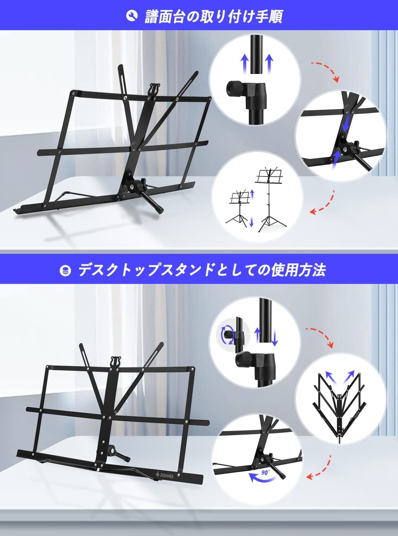 Donner 譜面台 軽量 折りたたみ式 楽譜クリップとファイル付き 楽譜スタンド 安定 80cmから135cmまで高さ調整 大容量収納ケース付き 楽譜たて デスクトップスタンド 軽量スチール製 ブラック