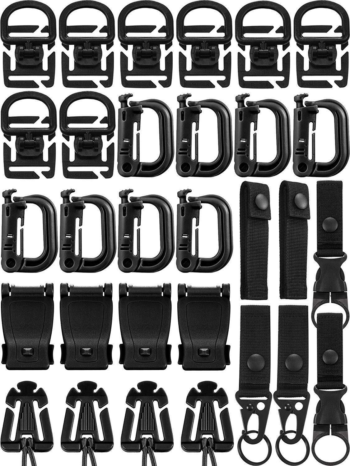 7種類全部30個セットあらゆる種類のニーズを満たす大容量 :ブラスチックカラビナ*8+ ウェブドミネーター*4+ベルクロ式ベルトキーホルダー*2 + Dリング 360 回転 フック ホルダ*8+タイ ロック吊り*2+ウェビングクリップ*4+ペットボトルホルダー ボトル ック 轻量*2 コスパ抜群 モールシステム対応 サバゲなどに最適