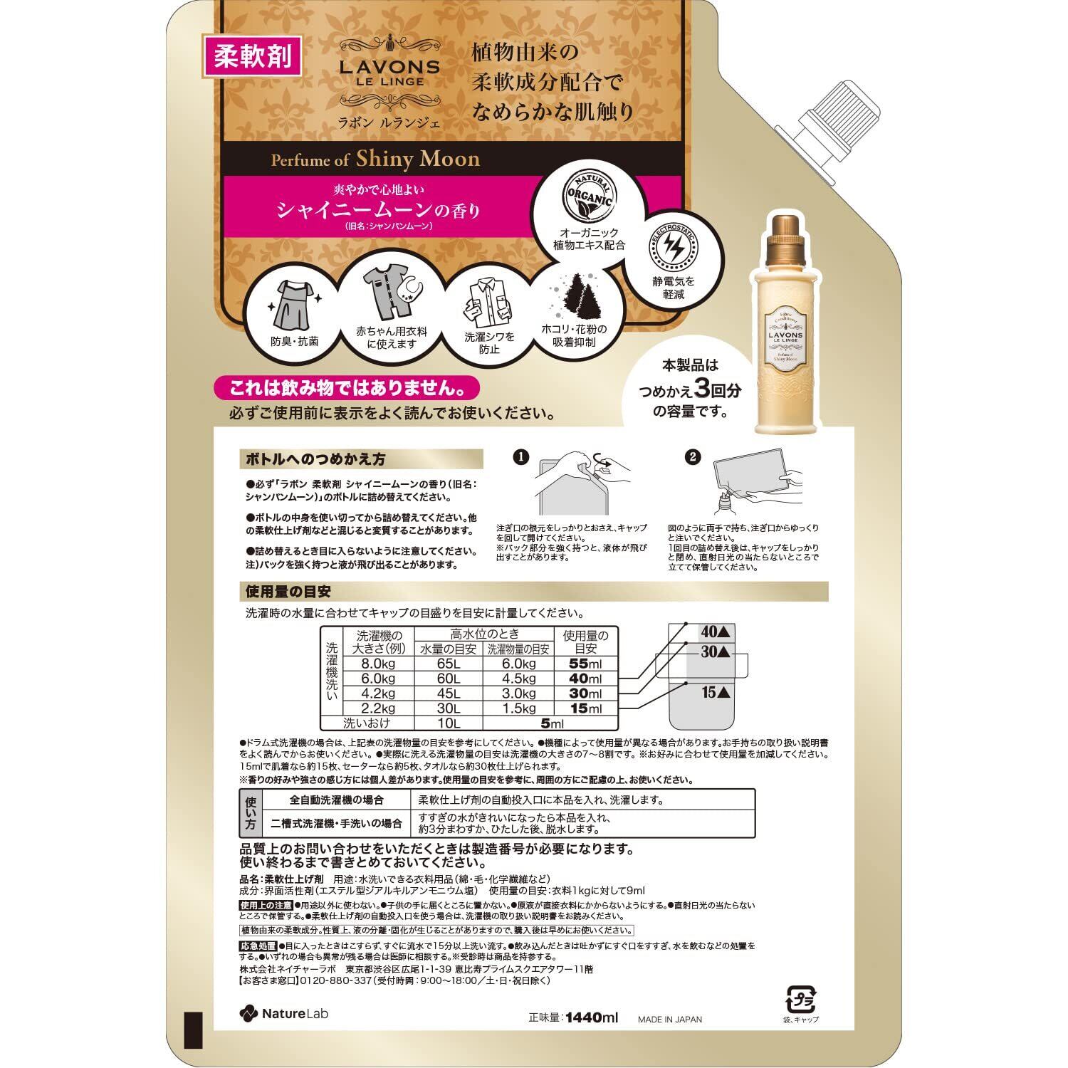 天然由来の香料を配合し、洗濯中から着用時まで香水のようなラグジュアリーな香りが持続。植物由来の柔軟成分配合でなめらかな肌触りに。赤ちゃん用衣類にも使えます。さりげない甘さがさわやかに香る心地よいフローラルグリーン系「シャイニームーン」の香り。 ●防臭・抗菌 ●洗濯シワを防止 ●静電気を軽減 ●ホコリ・花粉の吸着抑制 ●オーガニック植物エキス配合 ※パッケージデザイン等は予告なく変更されることがあります