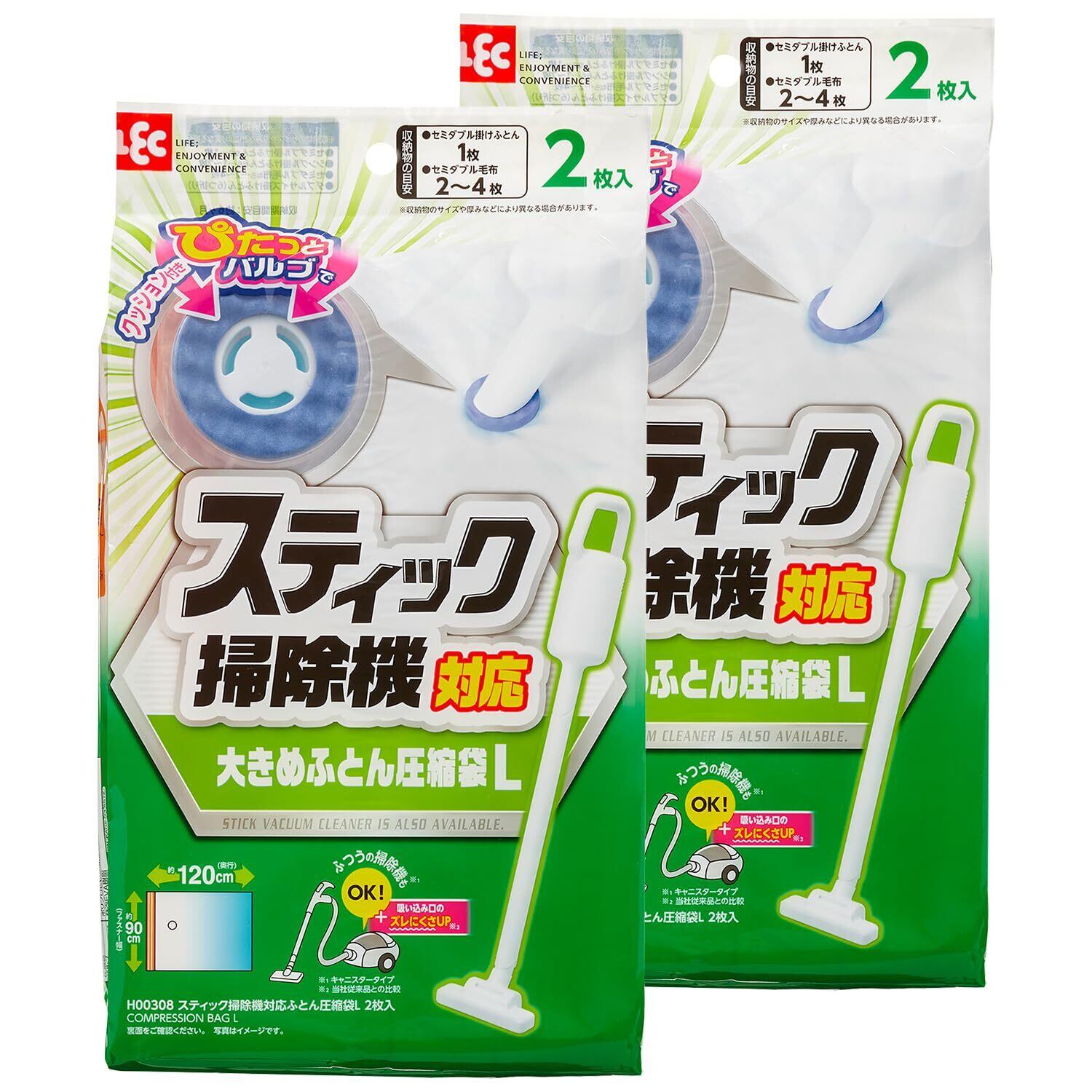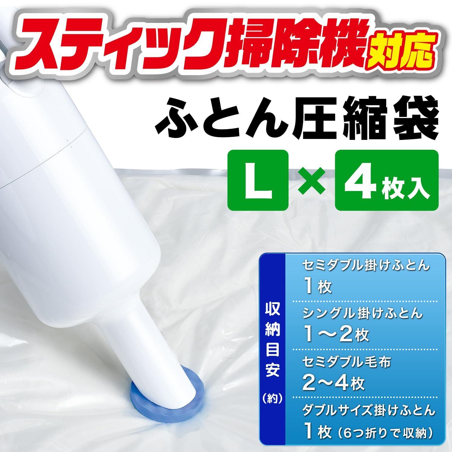 レック スティック掃除機対応 ふとん圧縮袋 Lサイズ (4枚入) /目安:セミダブル掛けふとん1枚/ふつうの掃除機もOK/H00308 透明