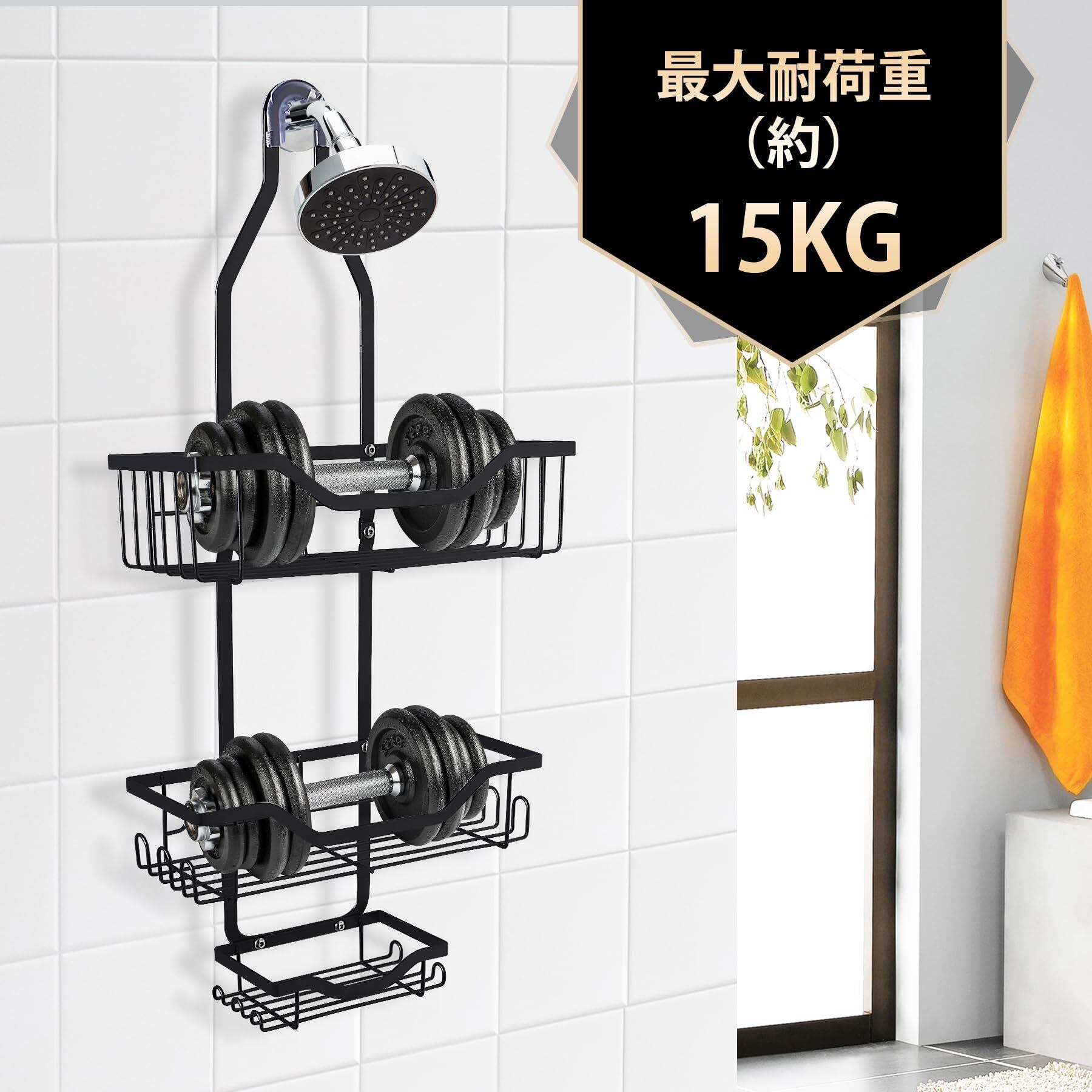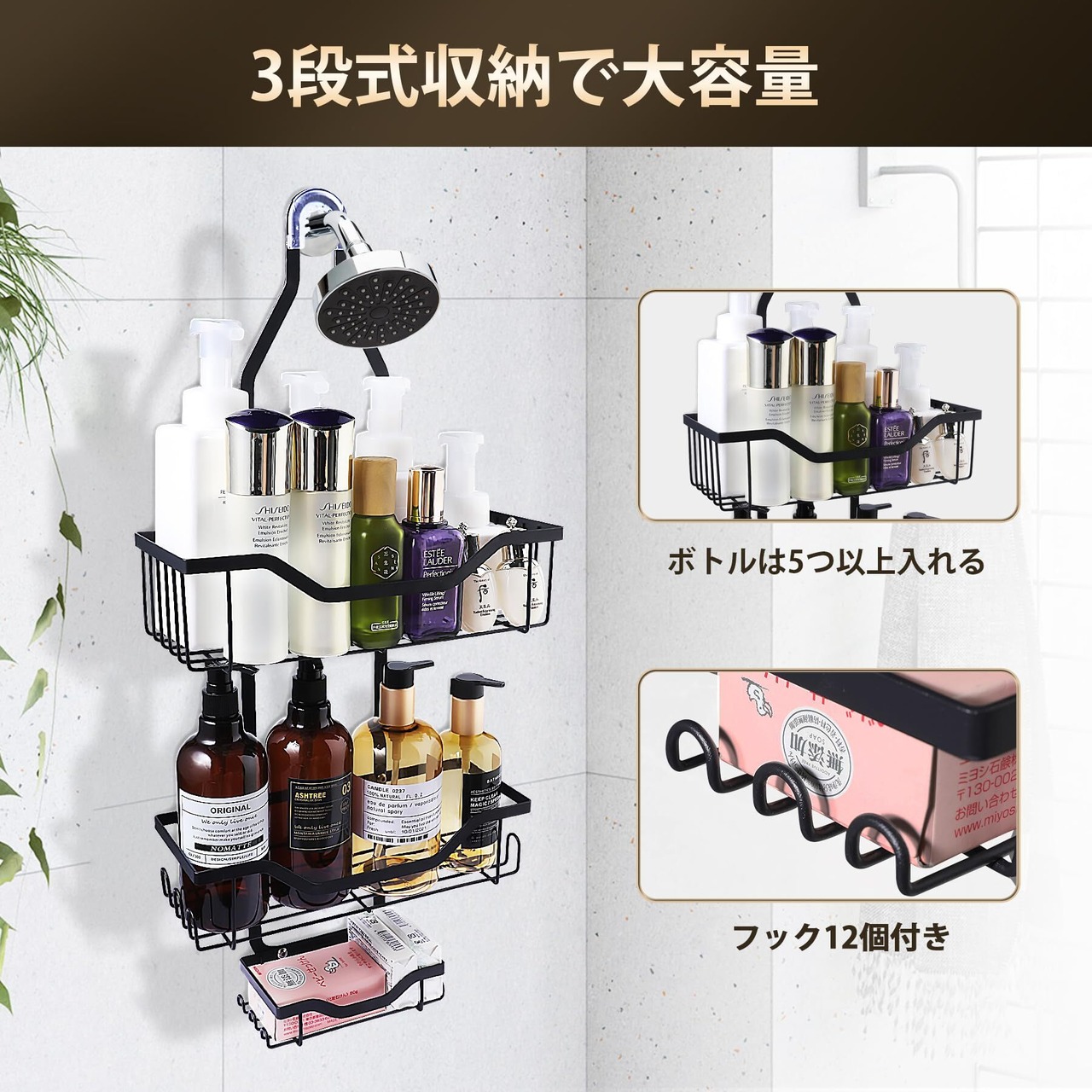 【いいデザイン】:バスルームに3段式シャワーラックを置くとスペースを有効活用できます。シャワーフックを使ってボトルや小物をすっきり収納できます。上段にはボトル5個以上、下段には小物を収納できます。フック付きで小物や泡立てネットなどもかけて置けます。