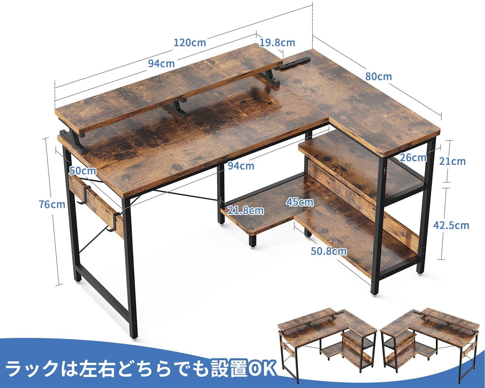 ODK l字デスク パソコンデスク L字型 ゲーミングデスク デスク 机 幅120cm コンセント付き desk PCデスク ラック付き 収納 オフィスデスク 省スペース 書斎 在宅勤務 組立簡単 ビンテージ