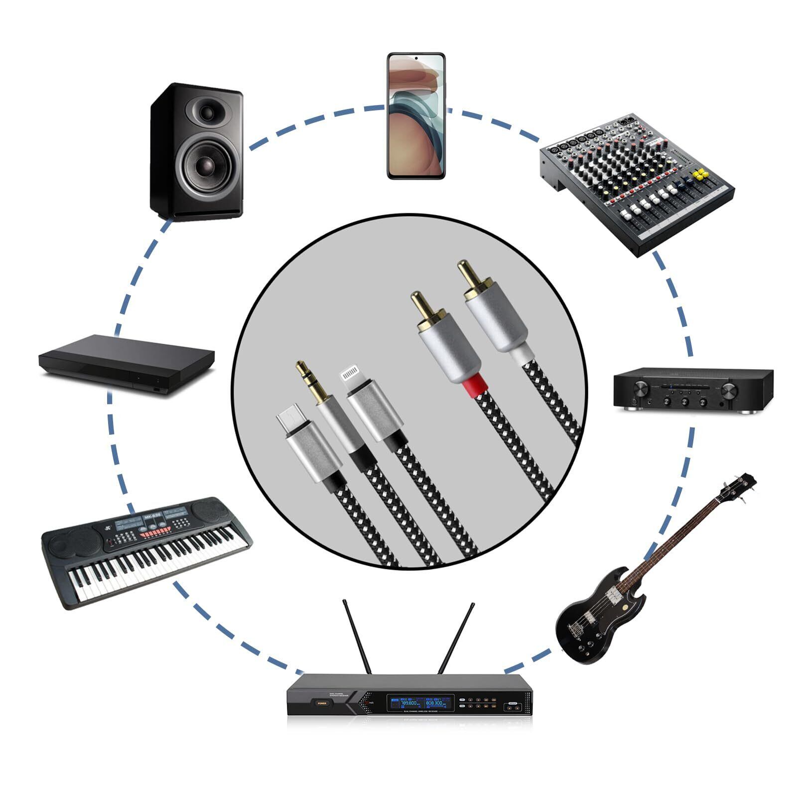【Meamaz MFi 認証】ライトニング USB - C 3.5mm~RCA コンバータオーディオケーダブル(内蔵 DAC チップ付き)、3-in-1~2 オス RCA、iOS 及び Android 携帯電話、家庭用シアター、ミキサー、プロジェクター、アンプ、DVD に対応(6.56FT/2m)