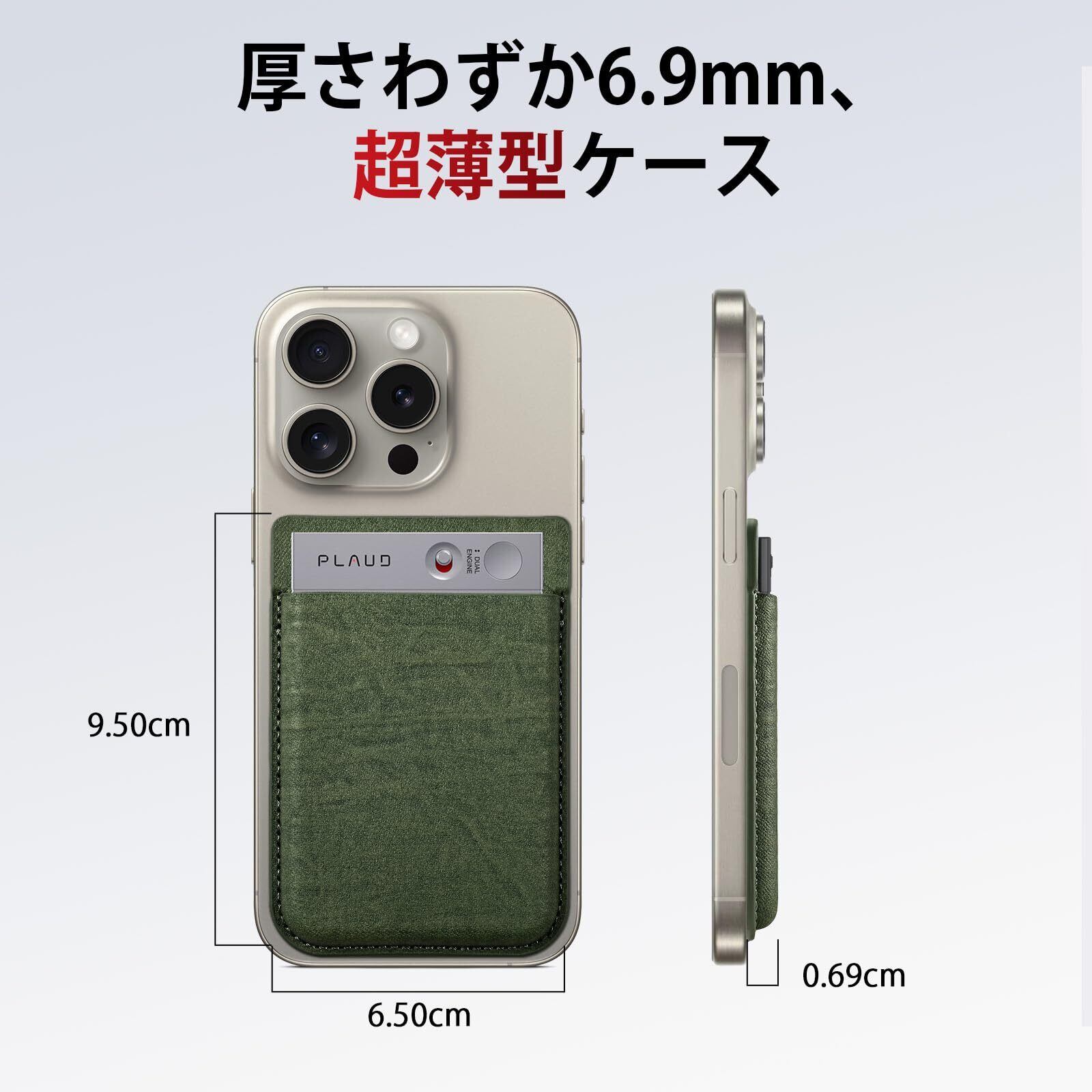 【ご使用注意】 ①MagSafe対応のiPhone機種に取り付ける時に、吸着力が弱いと感じる場合、ケースをiPhone背面のMagsafe中心位置を合わせて装着してみてください。 ②スマホケース(厚みに限る)をつけていても正常に電話録音できます。③ケースに入れたままでもPLAUD NOTEを充電することができます。