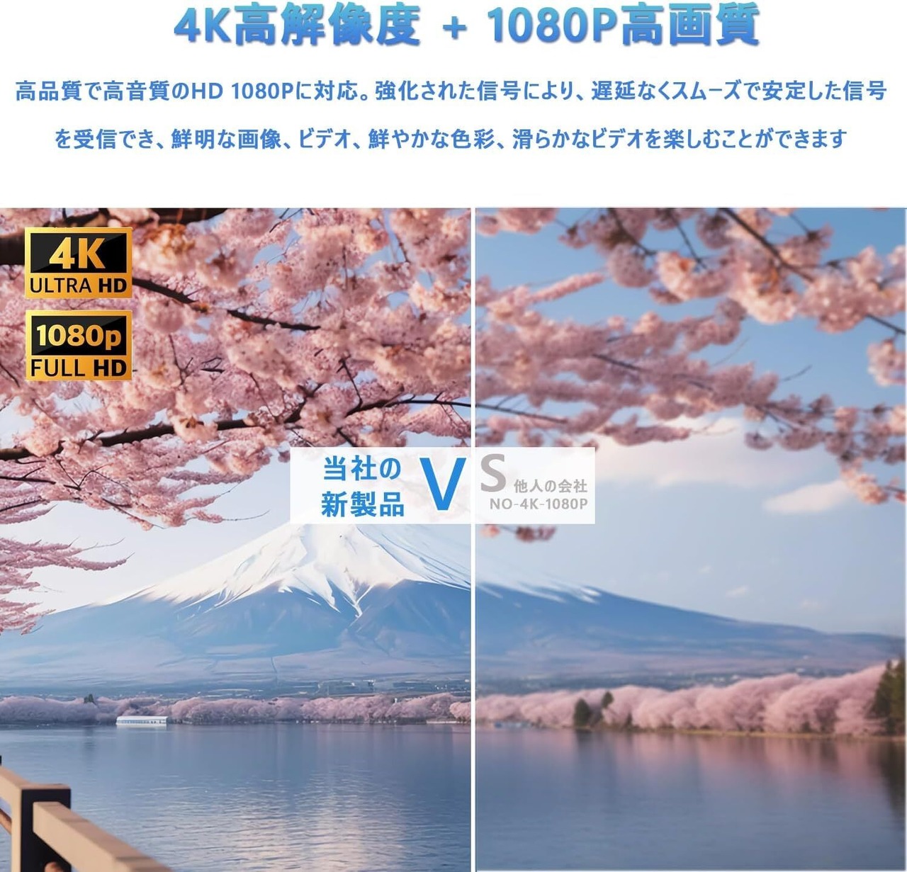 【1080P高解像度・4K高画質】最新発売のHDMI ミラーキャストは高画質、高音質のHD1080Pをサポートしています。高解像度で色鮮やかな映像をお楽しみいただけます。もっと強化された信号ケーブルは、hdmi ミラーキャストがゼロ遅延でより安定した信号を受信し、より安定した信号を受け取り、バッファまたは遮断の可能性を低減することができる。精細な画像、ビデオ、鮮やかな色彩、滑らかな映像を楽しむことができます。動画配信時に4Kのハイビジョン映像に対応できます。