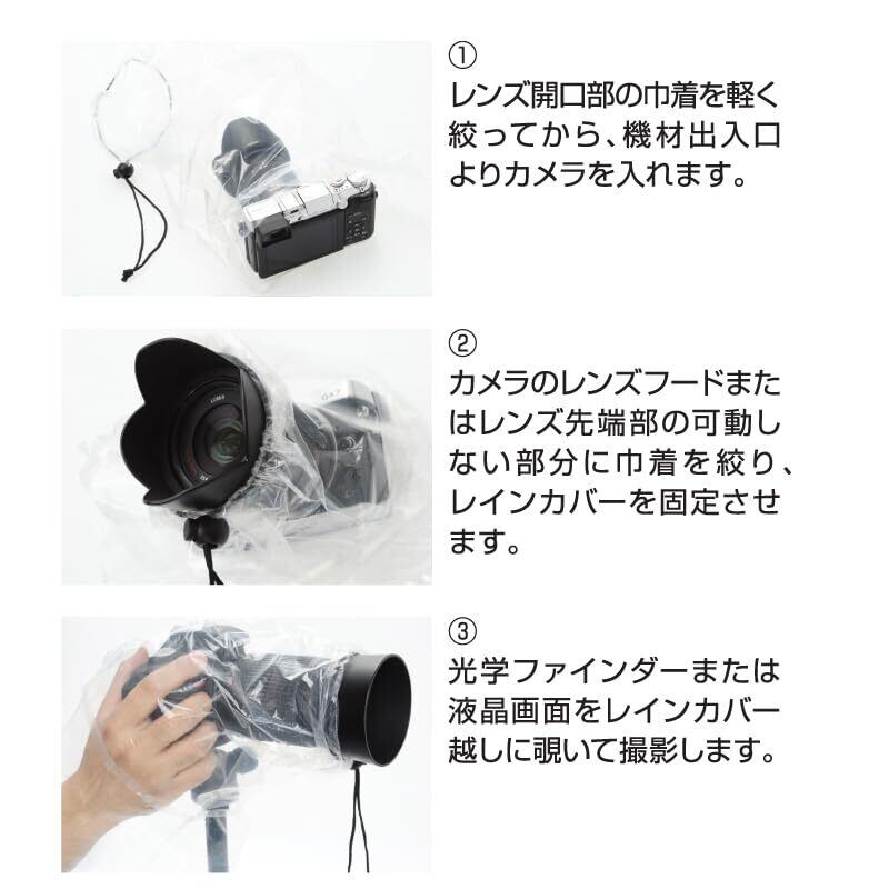 【突然の雨からカメラを守る!簡単装着のレインカバー】急な雨や雪、水辺での撮影時に、一眼レフやミラーレスカメラを水分、ホコリ、汚れからしっかり守るレインカバーです。透明素材を使用しているため、カバーを付けたままでカメラの設定確認やファインダーの覗き込みも可能。撮影中もストレスなく、思い通りの写真が撮れます。レンズ先端の紐を引っ張るだけで簡単に装着でき、手間いらずで即座に使用できます。