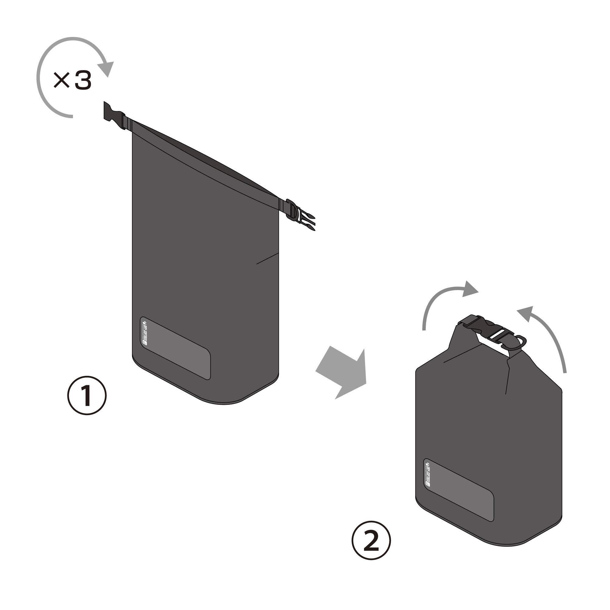 防水バッグのように入口を巻いて閉じる構造により密閉性に優れています。