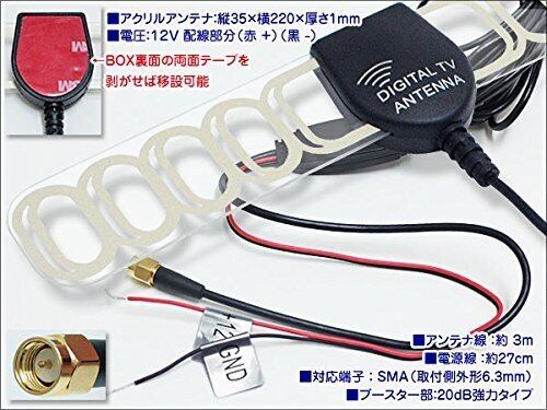 フィルムアンテナの場合は一度貼り付けたら動かせませんがこの商品はBOX裏面の両面テープを剥がせば移設可能。ブースターも12Vの電源を使用しますので安定した映像が供給されます。(アンテナブースターとは微弱な受信電波を強くして映りをよくする物ではなく、走行時や市街地等で現在キャッチしている電波を電圧により安定させる役割をもつ機能) ※貼り付け型フィルムアンテナ23756も別途有り。 ■アクリルアンテナサイズ:35mm×横220mm×厚さ1mm ■電圧:12線部分(赤+)(黒-) ■消費電力:約1.2W ■許容電流:約100mA ■硬質アクリル板の中にフィルムタイプアンテナが入っているタイプ ■アンテナ線:約3m ■電源線:約27cm ■対応機種端子:SMA(取り付け側外形6.3mm) ■ブースター部:20dB強力 ■受信感度【db】22±3DB ■出力阻抗【Ω】50Ω ※説明書は付属しません※電源はアクセサリー等から供給して下さい。 ※ブースター付きアンテナの場合どのメーカーでも同様ですが、受信感度に関してはお持ちの機種の相性により異なります。その点をご了承の上ご購入下さい。※外観及び仕様は予告なく変更になる場合もございます。