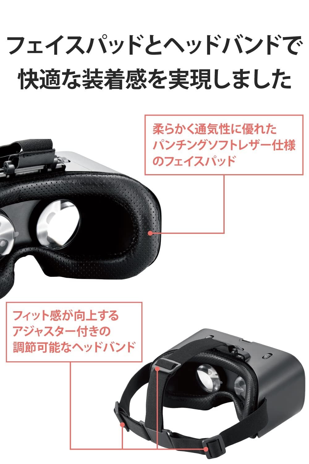●スマートフォンで充実したVR(バーチャルリアリティ)体験ができるスタンダードタイプのVRゴーグルとVRリモコンのセット製品です。●お手持ちのスマートフォンにVR対応アプリをインストールし、本体にセットするだけで、上下左右360度全方向の臨場感あふれる映像が楽しめます。●VRコンテンツ再生中に周囲を見渡すと、頭の動きに合わせて視界が360度動き、まるで自分がコンテンツの中にいるかのような仮想体験が楽しめます。●左右の目の幅に合わせて見やすい位置に調節ができる超ワイド目幅調節機能を搭載しています。●また、細かく焦点距離の調節ができるピント調節機能も搭載しています。●広い開口部設計により、眼鏡を装着した状態でも使用可能です。●※幅約142mm以内。●眼鏡の大きさ・形状によっては使用できない場合があります。●スマートフォンは差し込むだけで簡単に装着できます。●柔らかく通気性に優れたパンチングソフトレザー仕様のフェイスパッドを採用しています。●4.7~7.0インチの幅広いサイズのスマートフォンに対応しています。●歪みが少なく視野角が広い、VR専用設計の非球面光学レンズを採用しています。●VRリモコンはブラインドタッチに適したボタンレイアウトになっており、VR動画の再生/一時停止、早送り/巻き戻し、音量調整、決定、カーソル操作などがワイヤレスで行えます。●※iOS端末では、決定/戻る/カーソル操作は使用できません。●※VRリモコン:ご使用の端末、アプリによっては、本製品の一部のボタンが機能しない場合があります。●また、各ボタンの動作は使用するアプリの仕様に依存します。●※VRリモコン:本製品に対してすべての携帯電話、Bluetooth機器、アプリケーションとの接続をするものではありません。●※VRリモコン:カーソルの移動速度は、ご使用の端末の画面解像度によって異なります。●※対象年齢は15才以上です。●エレコム社環境認定基準を1つ以上満たし、『THINK ECOLOGY』マークを表示した製品です。●環境保全に取り組み、製品の包装容器が紙・ダンボール・ポリ袋のみで構成されている製品です。