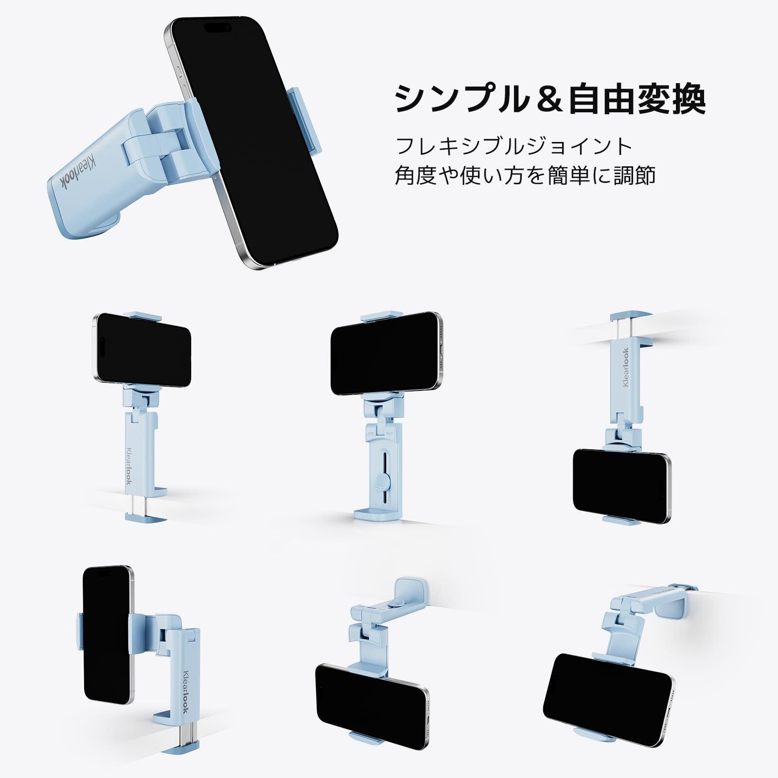 【使いやすい】使用方法としては、まず本製品を開いて、上部のホルダーでスマホを固定し、下部のクランプを開いて机の端に取り付けます。コンパクトなサイズで、簡単に収納できます。折りたたんでポケットに入れて、どこにも持ち運ぶことができます。