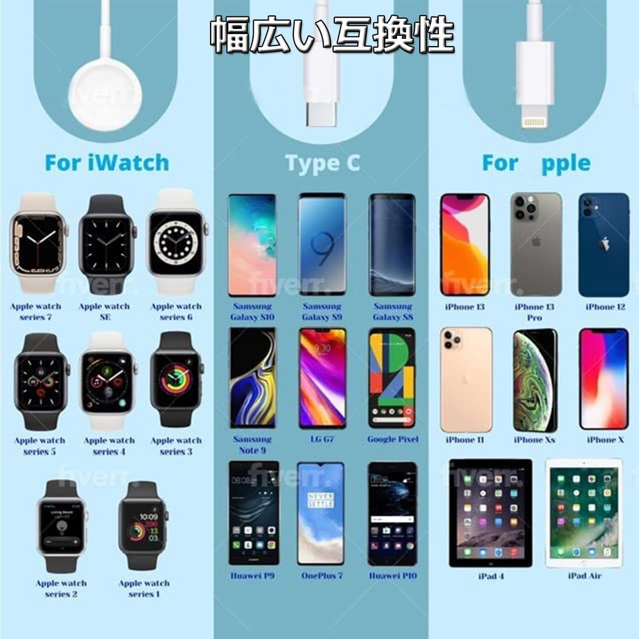 【3in1 A-pple Watch用 充電器】a-pple watch用充電器は、Phone、a-pple watch、Type-Cが一つになった超便利最新設計な一本三役の3in1充電ケーブルです。約2.5時間で急速フル充電できます。複雑な操作不要、1つのUSBポートから3台のデバイスが同時に充電できます。2024のアップグレード版なので、他社の商品より充電が速い。WatchとPhone、Type-Cの充電ケーブルの長さは異なり、同時に充電しても互いに干渉しません。