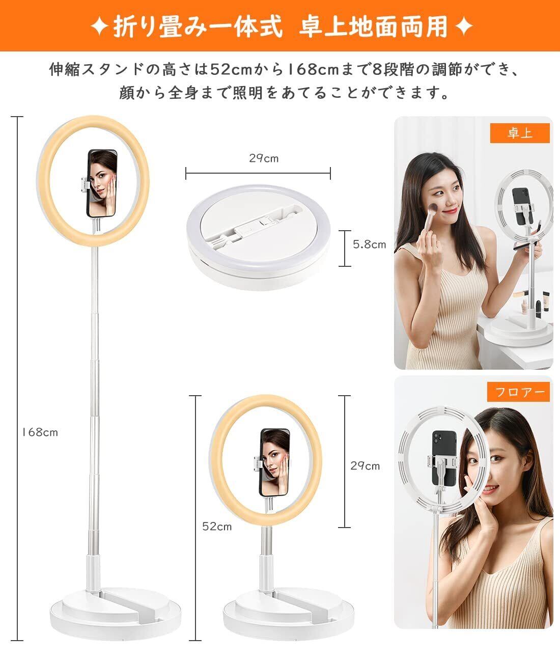 ✨【組み立てずに使用・収納便利】普通の撮影照明ライトと比べると、本製品は三脚不要、雲台不要、組立て不要、折りたたみ一体式のリングライトです。組み立てずにサッとセッティングして使うことができます。別付けで使うパーツはない、収納後の幅も約29CMで、厚さは約6CMになり、コンパクトで使用し終わったら引出しに収納でき、持ち運びのも楽になります。