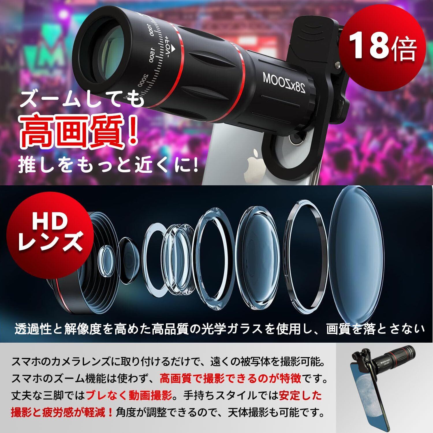 【18倍HD 単眼鏡 高倍率 望遠レンズ】18XHDスマホ ボウエンレンズ、遠い景色をより近づけて、クリアな写真が撮れるスマホ レンズ。望遠レンズ スマホでは、遠い景色を撮影しても画質が劣化することなく手軽に遠距離の被写体を撮影できます。22X 望遠レンズを使用する時は、モバイル画面に触れてフォーカスを調整しないでください。カメラのメインカメラが変更する可能があります。【定点観測も可能】旅行先やお子様の行事等で大活躍!三脚・スマホ固定クリップ等必要な付属品は全て揃っております!アイキャップを付けると単眼望遠鏡として使えます。【軽さは力 脅威の96g】手のひらサイズ 本体12×3.5cm 軽量化と合わせてサイズダウンにもこだわりました。 シェアに非常に便利な品です。