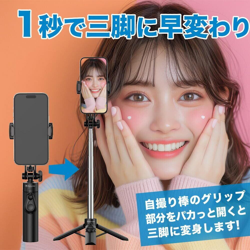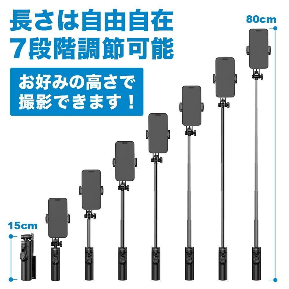 【1秒でスマホ三脚に早変わり】セルカ棒のグリップ部分をパカッと開くだけで、瞬時に三脚付きスマホスタンドに変身。撮影やビデオ通話に便利です。【80cmまでぐ〜んと伸びる】最大80cmまで伸ばせるので、大人数の集合写真や風景撮影にも対応。しっかりとフレームに収まります。【長さは自由自在!7段階調節可能】お好みの高さに調整できる7段階の伸縮機能を搭載。15cmから80cmまで自由に伸ばせます。
