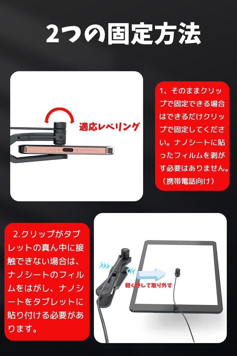 【2つの固定方法】2、そのままクリップで固定できる場合はできるだけクリップで固定してください。ナノシートに貼ったフィルムを剥がす必要はありません。(携帯電話向け) クリップがタブレットの真ん中に接触できない場合は、ナノシートのフィルムをはがし、ナノシートをタブレットに貼り付ける必要があります。