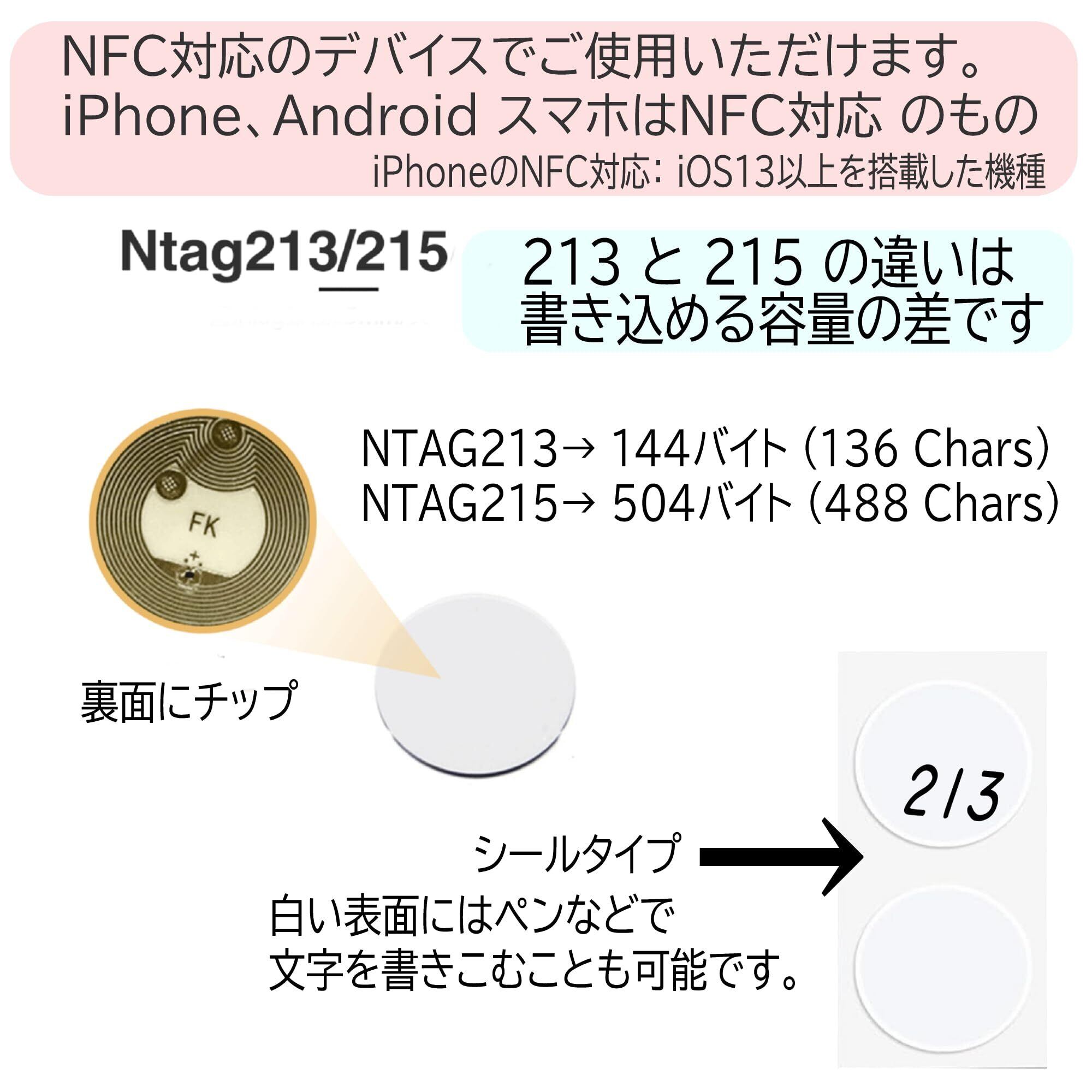 【タグシール6枚】 NTAG213(144バイト)とNTAG215(504バイト)の2種類、計6枚を用意。書き込める容量が違うので、用途に応じた選択が可能です。