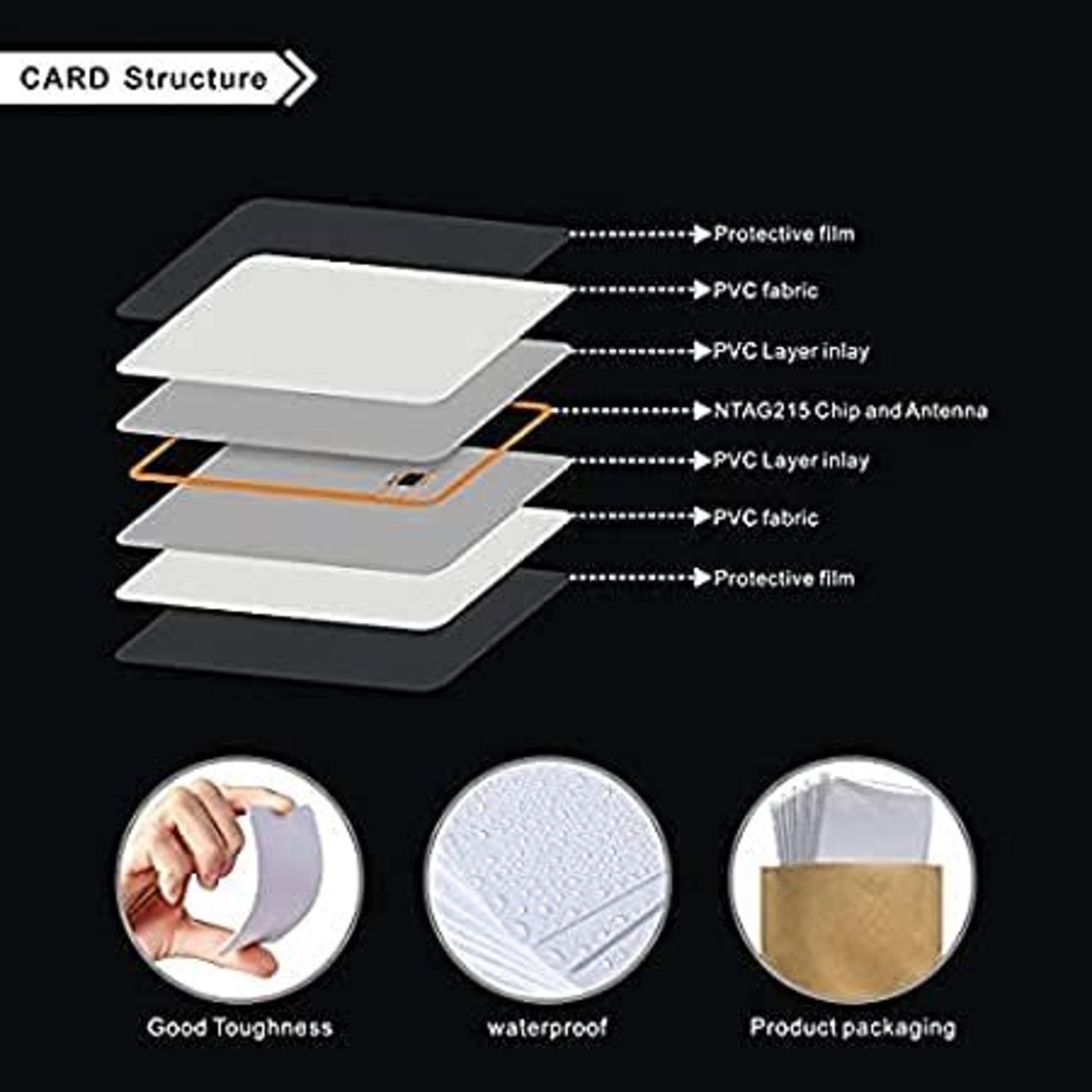 パッケージ内には何が入っていますか:10枚NFCカード, pvc素材、標準のクレジットカードサイズ、防水性,熱転写印刷装置に適しています