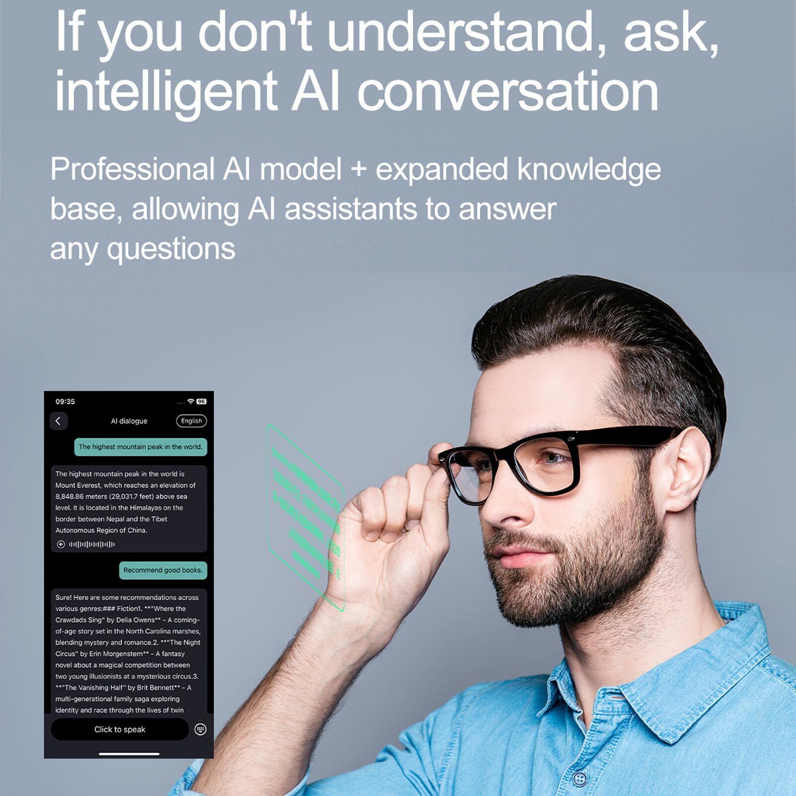 アイケアテクノロジー:Bluetoothスマートグラスは、青いライトブロックレンズを備えており、目を厳しい光の露出から保護しています。 1つのボタンを使用して、スマート翻訳をアクティブにするか、AIヘルパーを呼び出して、ビジョンを保護しながら使いやすさを確保します。