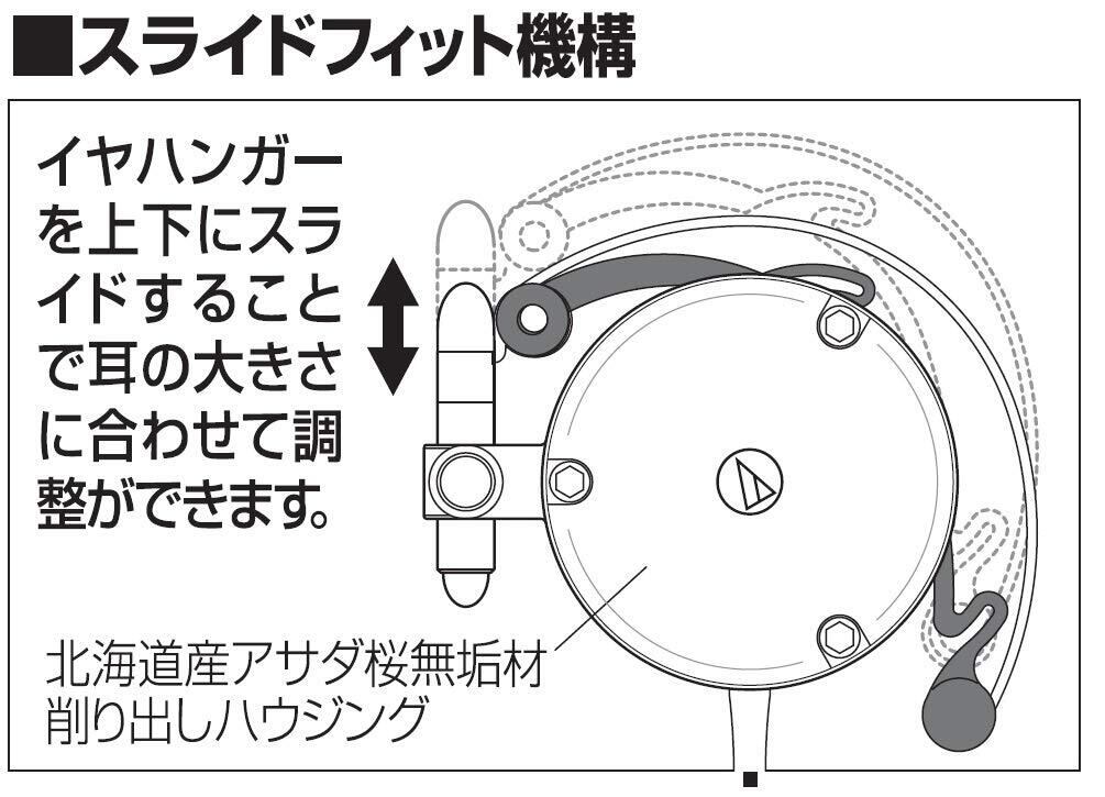 ■北海道産アサダ桜の無垢削り出しハウジング採用の高音質設計。■イヤハンガーを上下にスライドさせ、耳の大きさに合わせられるスライドフィット機構。■耳にやさしい、ラバーサポート付きのイヤハンガー(PAT.P)■強磁力ネオジウムマグネット使用のφ28mm大口径ドライバー搭載■延長コード(1.0m)付属で、ケーブルの長さを変更可能。■持ち運びに便利なポーチ付き。