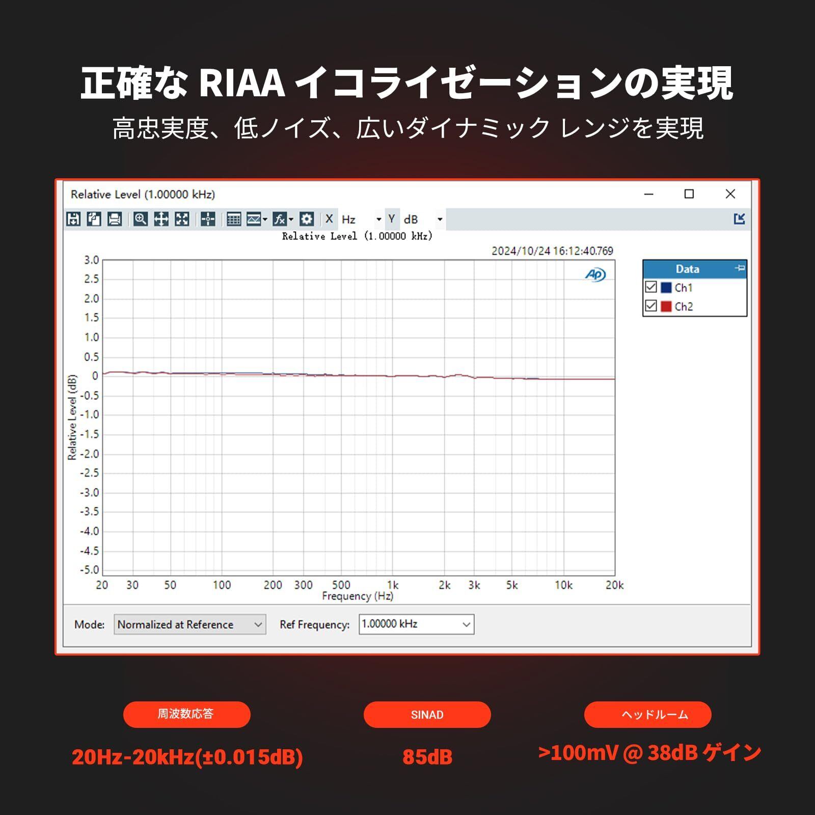 【複数のゲイン設定】 38/48/56/66dBの4段階ゲイン調整設定により、プリアンプはMMとMCの両方のカートリッジタイプに対応し、さまざまなニーズを満たします。これにより、フォノステージが強化され、ビンテージステレオサウンドの再構築に役立ちます。