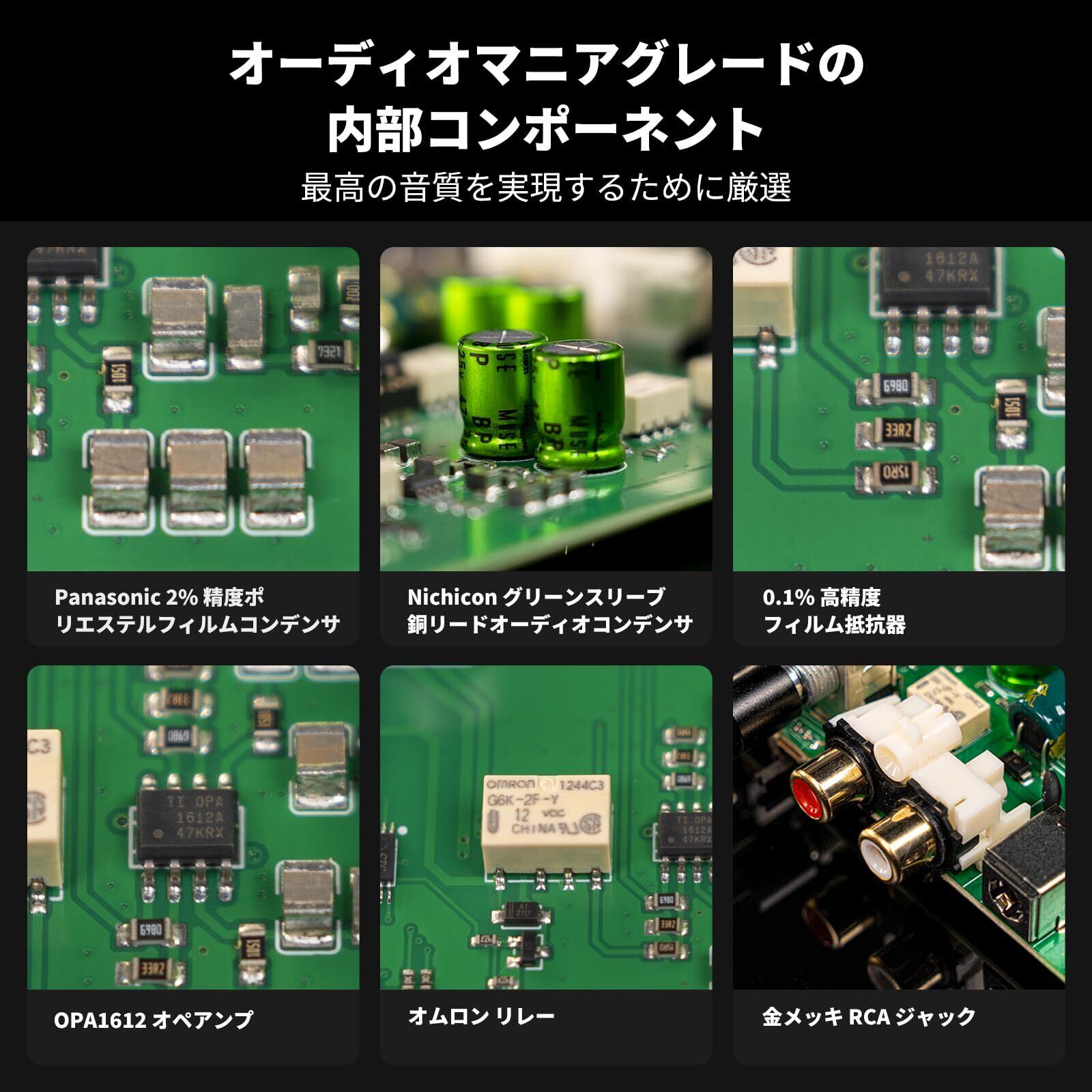 【オーディオマニアグレードのコンポーネント】このプリアンプは、2% 精度ポリエステルフィルムコンデンサ、グリーンスリーブ銅リードオーディオコンデンサ、0.1% 高精度フィルム抵抗、OPA1612 オペアンプ、金メッキ RCA ジャックなど、さまざまな素材を使用しています。そこから生み出される微妙で有限なディテールを拾い上げ、真に暖かく魅力的なサウンドを届けます。
