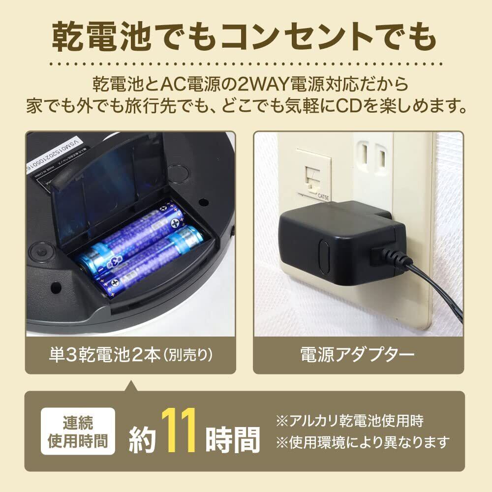 AC電源(家庭用のコンセント)と、乾電池の2電源対応! およそ連続11時間再生可能なので、長距離移動にも便利です。