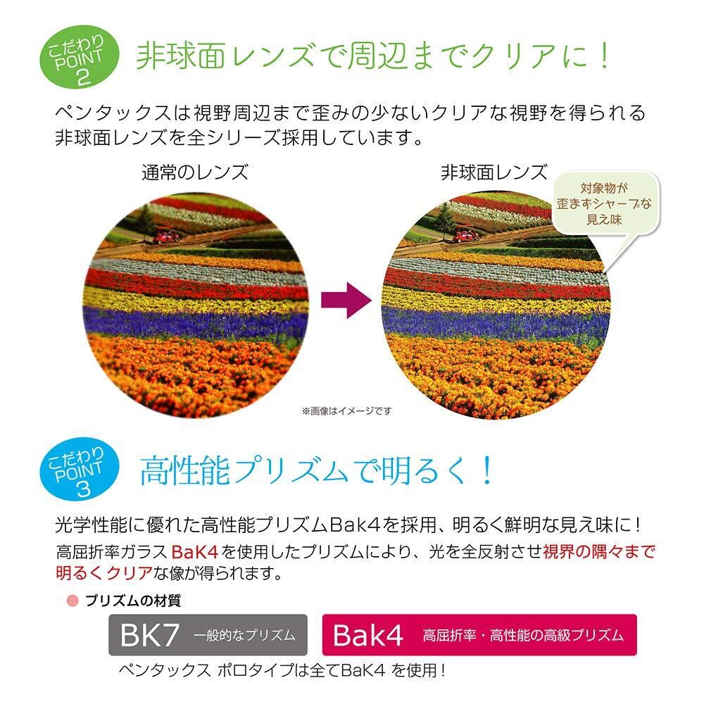 レンズに施したマルチコートと高屈折率ガラスBaK4を使用したプリズムにより、光の透過率と反射率を向上しており、明るい視野が得られる。また、非球面レンズを採用し、視野の周辺部まで歪みの少ないクリアな像を実現している。