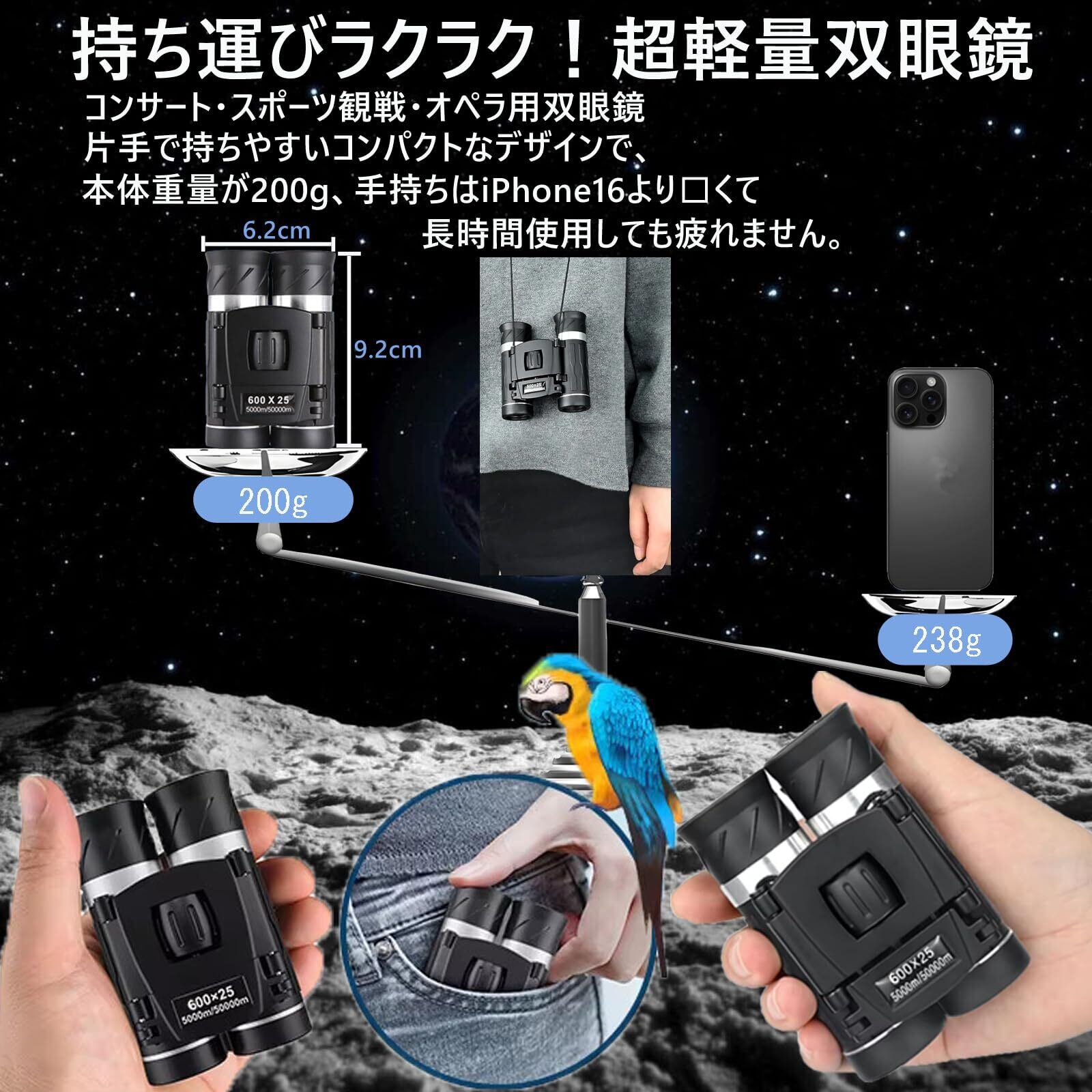 【超軽量200g・コンパクト設計】どこでも持ち運びラクラク 本体わずか200gの軽量設計&折りたたみ可能で、ポケットやバッグにすっきり収納。ネックストラップ付きで首掛けもOK。女性やお子様にも扱いやすく、観劇・旅行・登山などあらゆるシーンに最適です。