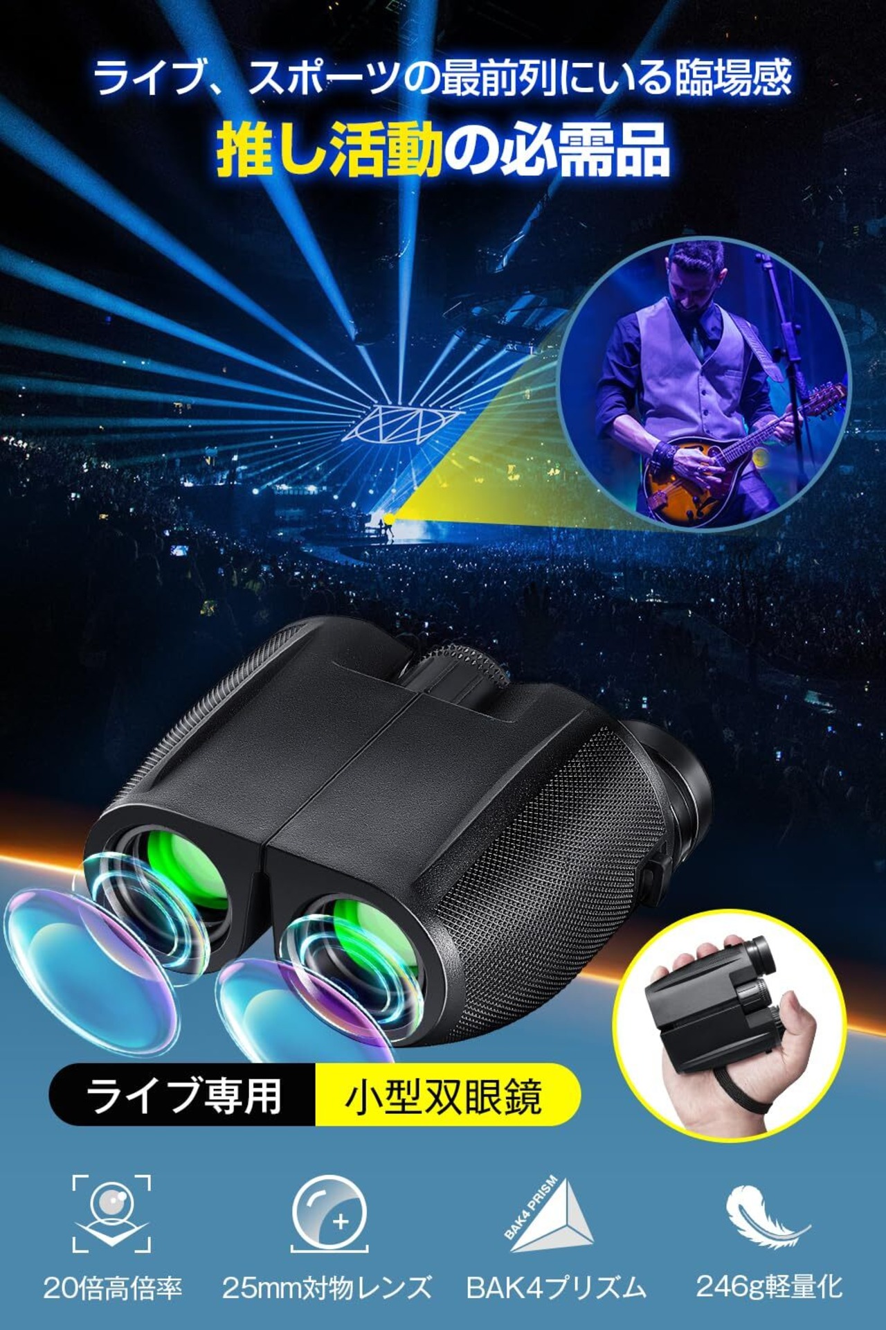 双眼鏡 ライブ用 20倍 【新設計・超軽量】 オペラグラス スポーツ観戦用 双眼鏡 コンサート用 防振 小型 高倍率 広視野 高級BaK4プリズム ライブ用双眼鏡 防水 倍率調整可能 望遠鏡 収納バッグ・ストラップ付き ライブ/コンサート/観劇/登山/旅行/ドーム/スポーツ アウトドア 日本語説明書 (Black)