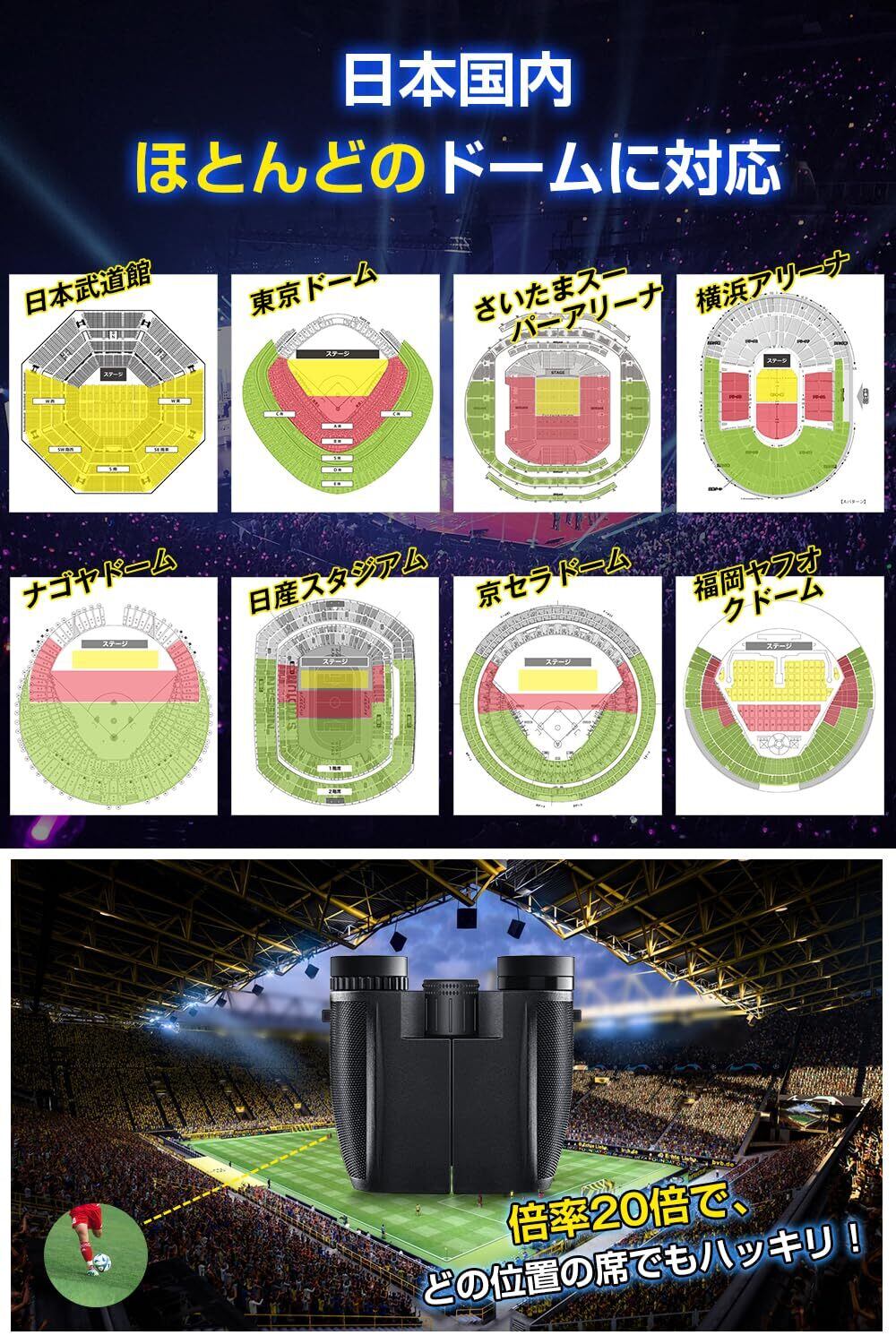 【高倍率と広視界の実現】 20倍の高倍率と25mmの対物レンズを搭載し、広い視野を提供します。遠くの景色やアクションを詳細に観察できるため、ドームやスタジアムでの観戦に最適です。視界の広さとクリアさを両立させ、細部まで見逃しません。