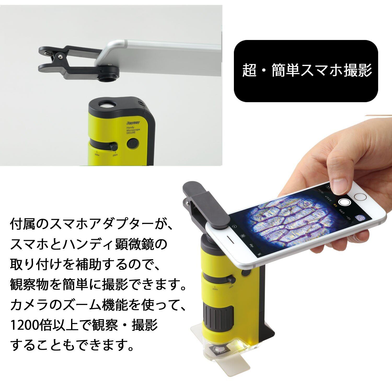 付属のスマホアダプターが、スマホとハンディ顕微鏡の取り付けを補助するので、観察物を簡単に撮影できます。カメラのズーム機能を使って、1200倍以上で観察・撮影することもできます(スマホの機種により倍率は異なります)。