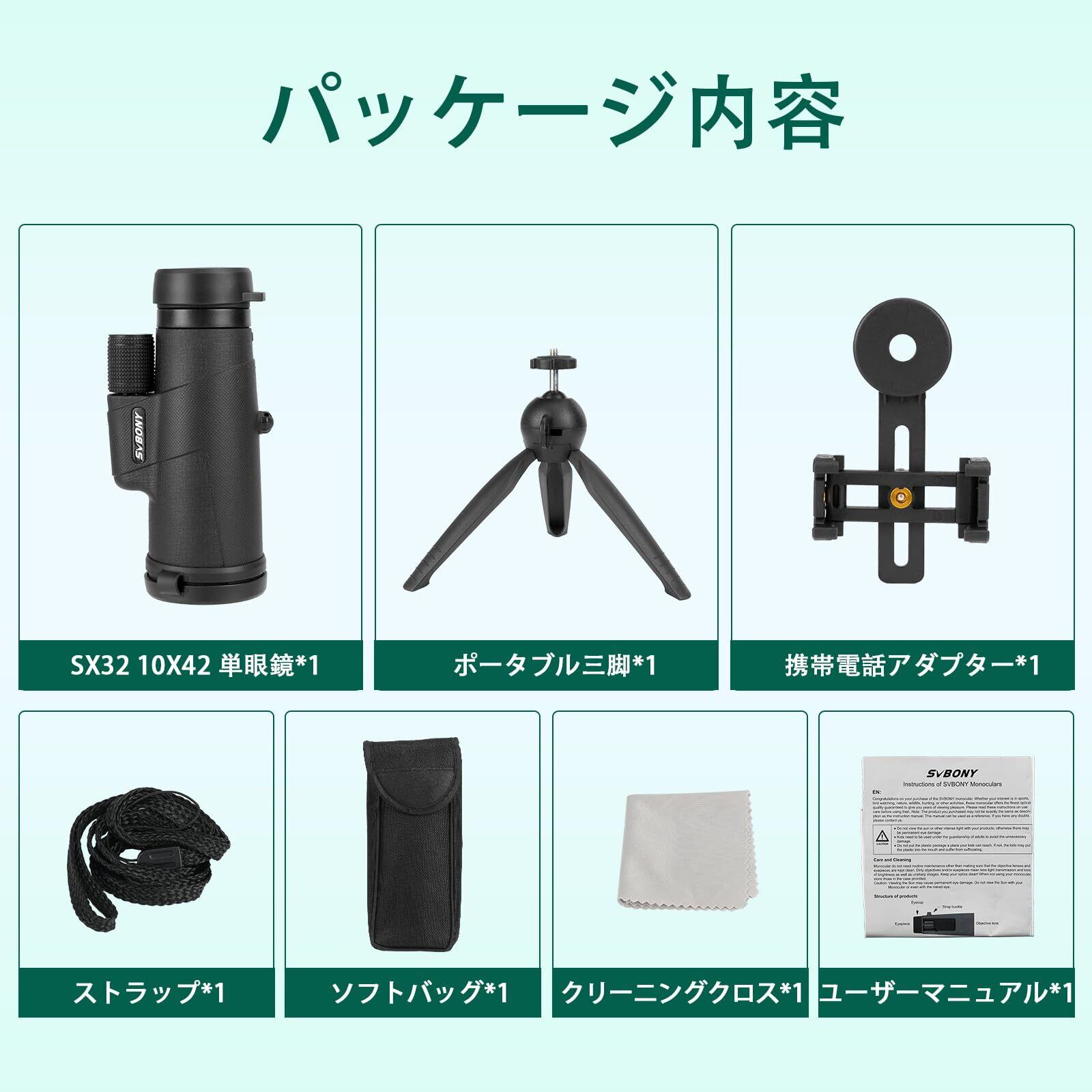 SVBONY SX32 単眼望遠鏡 10倍 42mm 大口径 高倍率 小型 256g スマホ対応 メガネ対応 Bak4プリズム IPX5防水 単眼鏡 望遠鏡 片手操作 ハイキング 旅行 バードウォッチン 野鳥観察 自然観察 コンサート スポーツ観戦 革の質感 耐摩耗性(10x 42mm、ブラック)