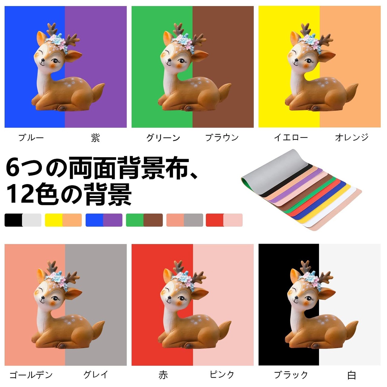 【両面背景6枚】簡易スタジオ、取り外し可能な12色の背景シート6枚(黒/白/灰色/金/黄/オレンジ/赤/ピンク/青/紫/緑/茶)が付属しています。 柔らかい布を装備しているため、反射率の高い製品の撮影や高露出の低減に適しています。 背景色を簡単に変更し、ニーズに合わせてさまざまな撮影シーンを構築できます。