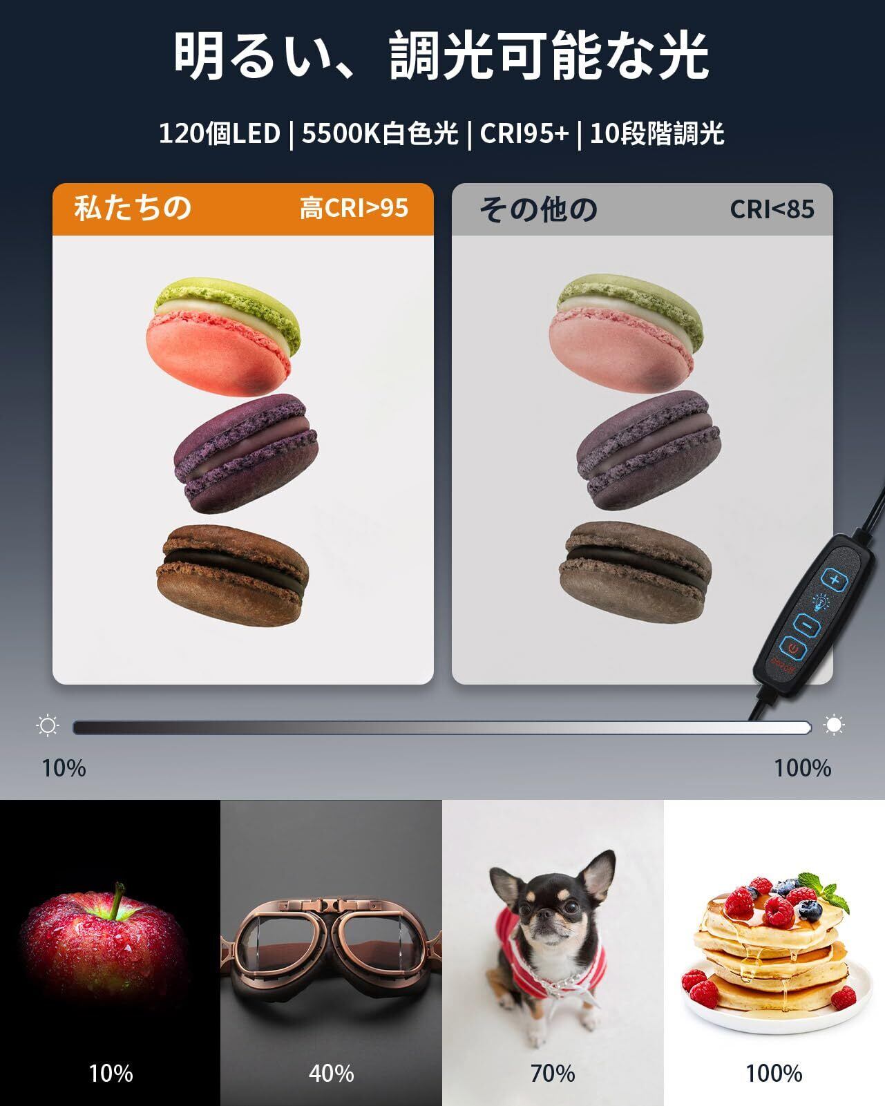 【調光可能な明るさ付き】10段階の調節可能な明るさを内蔵しており、ちらつきなく徐々に明るさを調節でき、どんなスマートフォンやカメラでも簡単に高品質な写真を撮影することができます。そのほか、反射する被写体の光点を和らげたり、影を減らしたりする必要がある場合は、付属の拡散布を1枚取り付けるだけで、簡易撮影スタジオ内のリングライトストリップをカバーすることができます。
