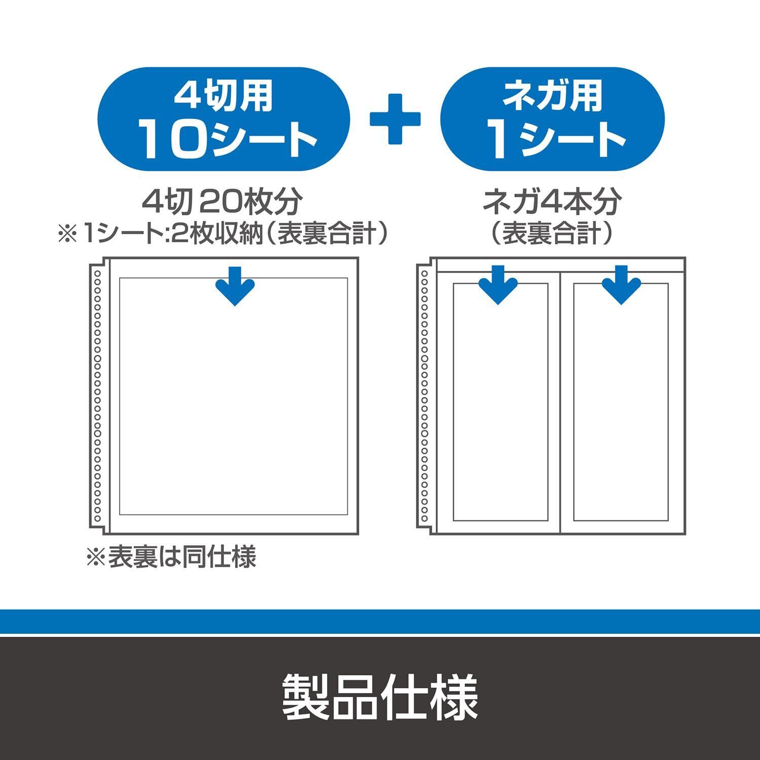 4切サイズ用10シート、ネガフィルム用1シート入り。1シートあたり、両面合わせて2枚の4切サイズ写真を収納できます。