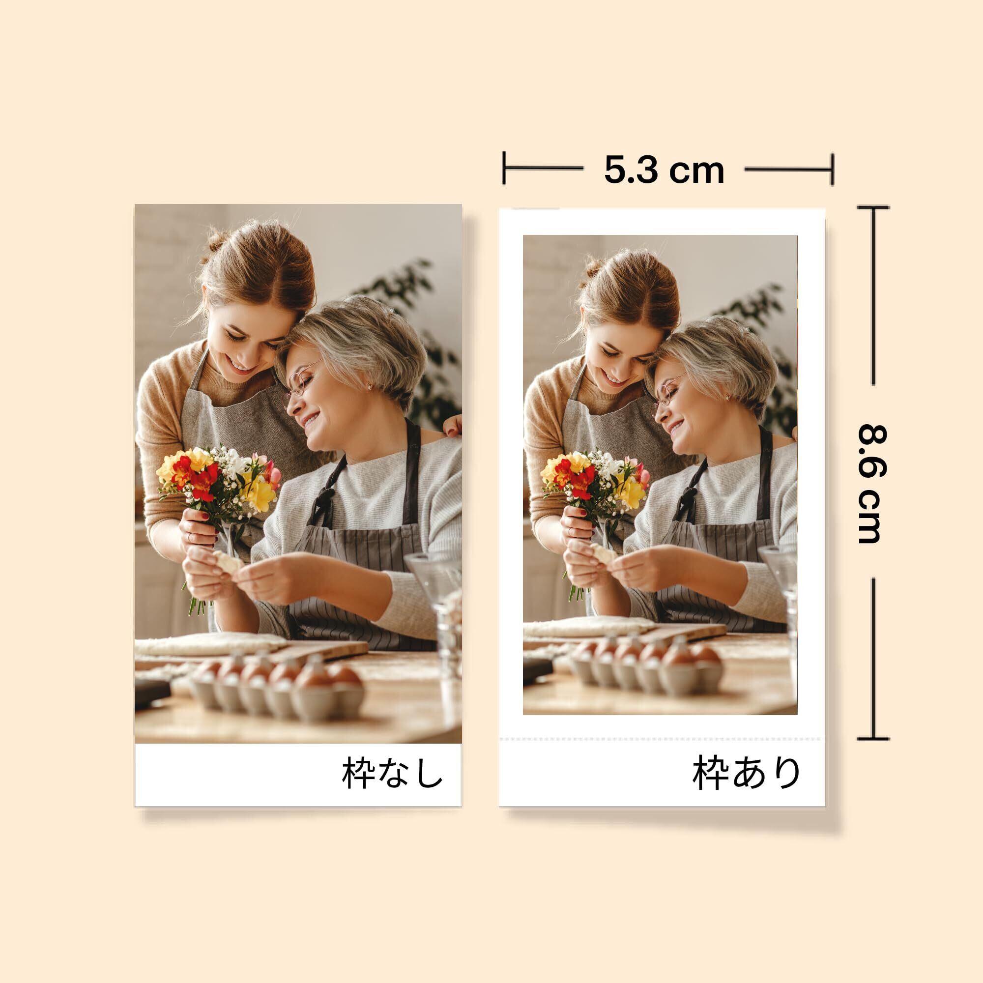 2種類の枠タイプ: 枠ありと枠なしの両方の写真を印刷できます。 このプリンターは、思い出を書き込むことで、長時間の記憶を保管することができます。 大きめのサイズがお好みの場合は、枠なしタイプで印刷してもOK!