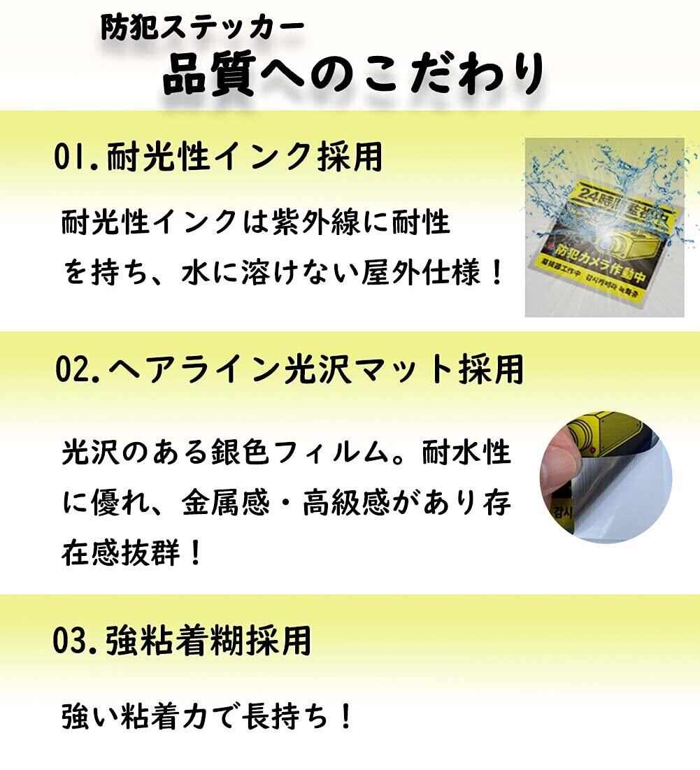 品質へのこだわり:(1)耐光性インク採用 耐光性インクは紫外線に強く、色褪せしにくいことが特徴です。水にも溶けないので屋外環境に適しています。(2)ヘアライン光沢マット採用 厚みのあるヘアライン光沢マットは金属感や高級感があり、防犯意識の高さを伝えることができます。(3)強粘着糊採用 強粘着糊は屋外の厳しい環境にも対応します。 ※:ステッカーの経年劣化は、使用環境により異なります。
