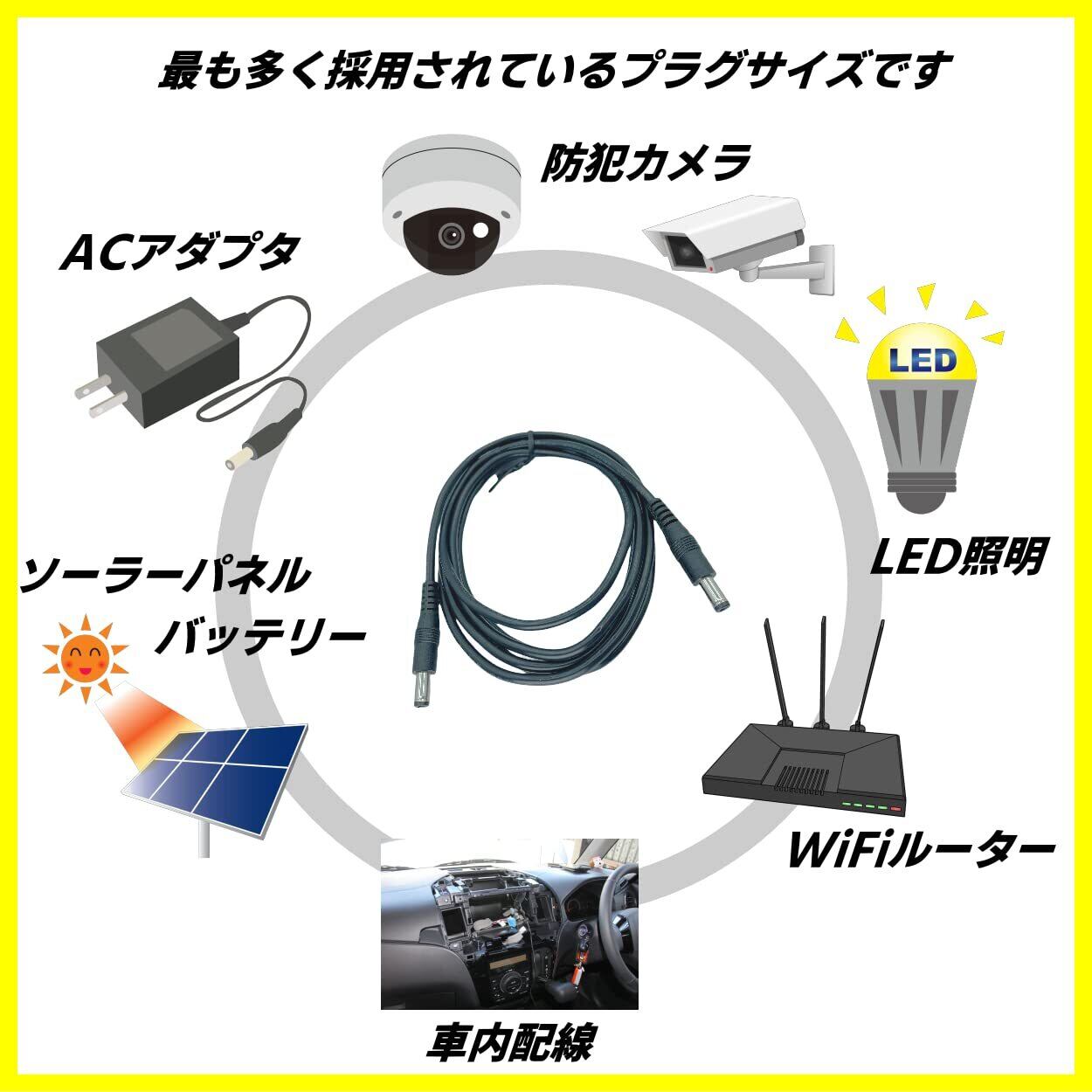 【用途】 □DCケーブルで多く採用されているプラグサイズ5.5/2.1mmです。 □ACアダプタ、監視 防犯カメラ、ソーラーパネル、LED照明、ペット餌やり、ビデオレコーダー電源供給ケーブルなど用途はいろいろです。