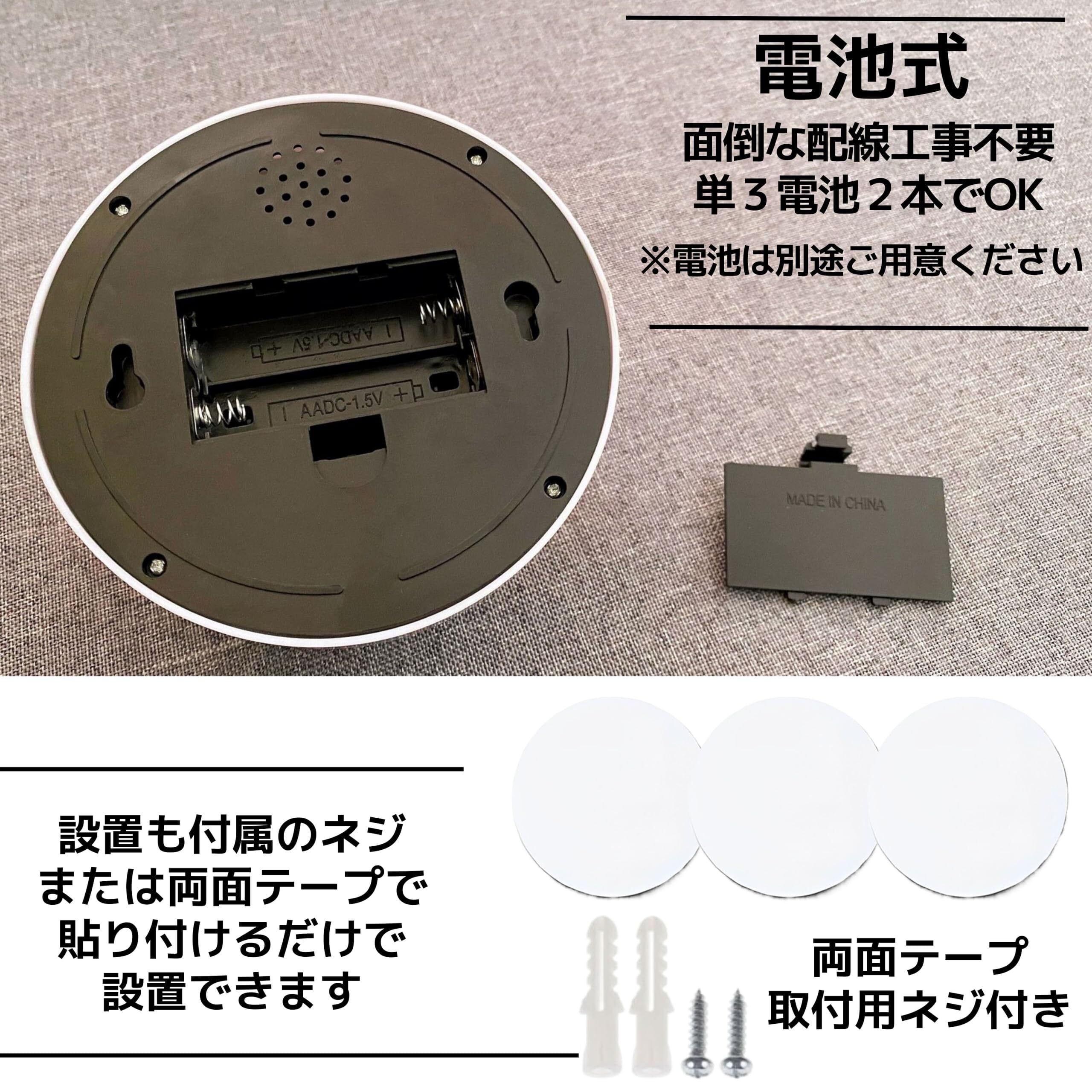 【電池式】面倒な配線工事不要、単3電池2本でOK。設置も付属のネジまたは両面テープで貼り付けるだけで設置できます。※お客様の声をいただき両面テープの使いやすさ向上のため厚さを1mmから3mmへアップしました。