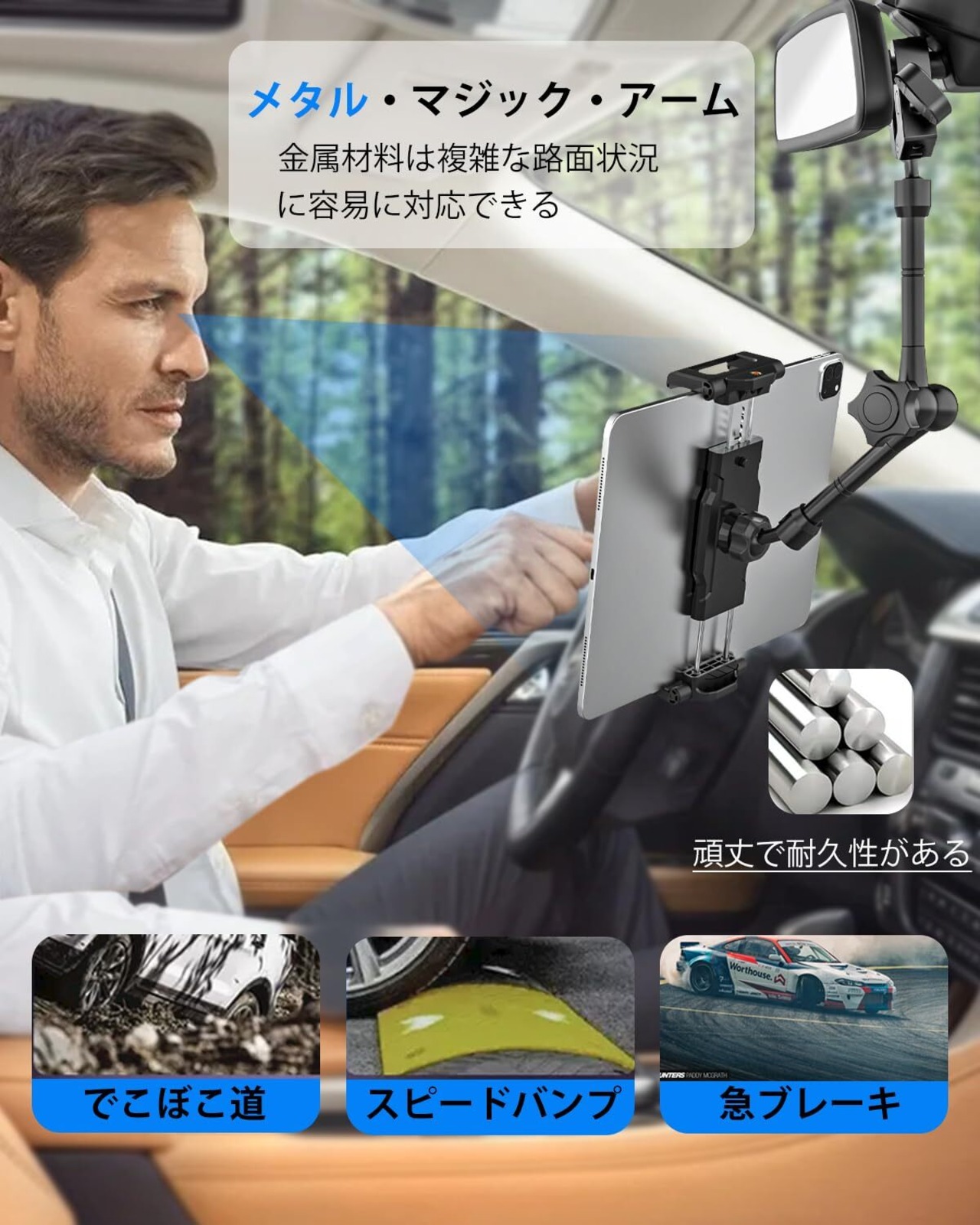 【金属マジックアームデザイン】: バックミラー車載iPadホルダーは高強度の金属素材で作られており、ブラケットが安定して揺れません。急カーブでも凹凸のある道でも、タブレットをしっかりと支えます。