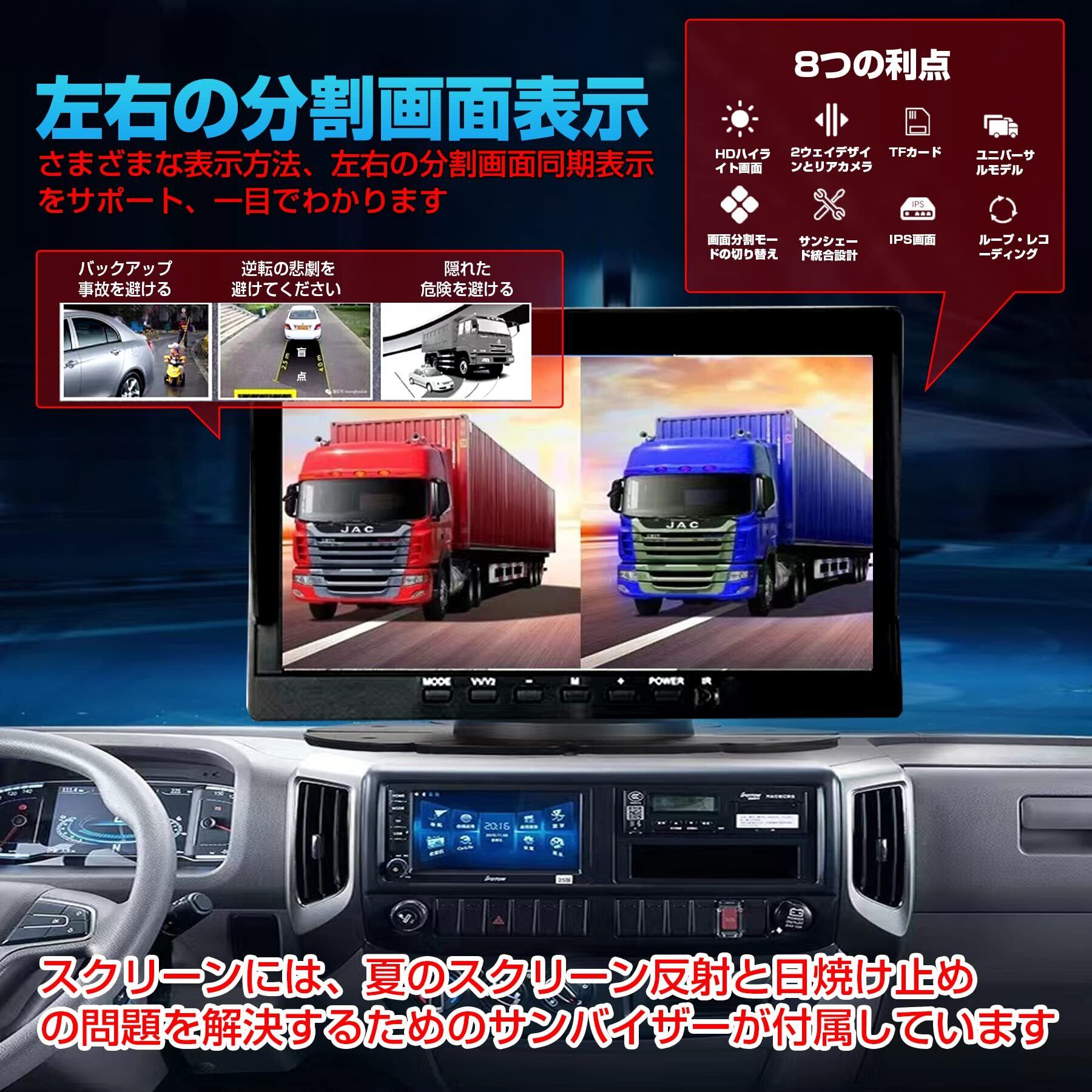 サンバイザー付きトラックリアモニター:7インチの大型LCDスクリーン、強い光の下でもはっきりとスクリーンを見ることができます、それはいくつかの表示モードを可能にする2つのビデオ入力をサポートしますシングルフルビュー、スプリットデュアルビュー