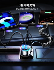 【 PD+QC3.0対応デュアルポート】タイプCコイルケーブルは最大36W、PD(タイプC)ポートは最大30W、QC3.0(USB A)ポートは最大25Wの出力を実現。30分でiPhone 16を60%、またはAndroidデバイスを70%まで急速充電可能。シガーソケットUSB充電器の新しいスタンダードとして、充電のスピードと効率を革命的に向上させます。