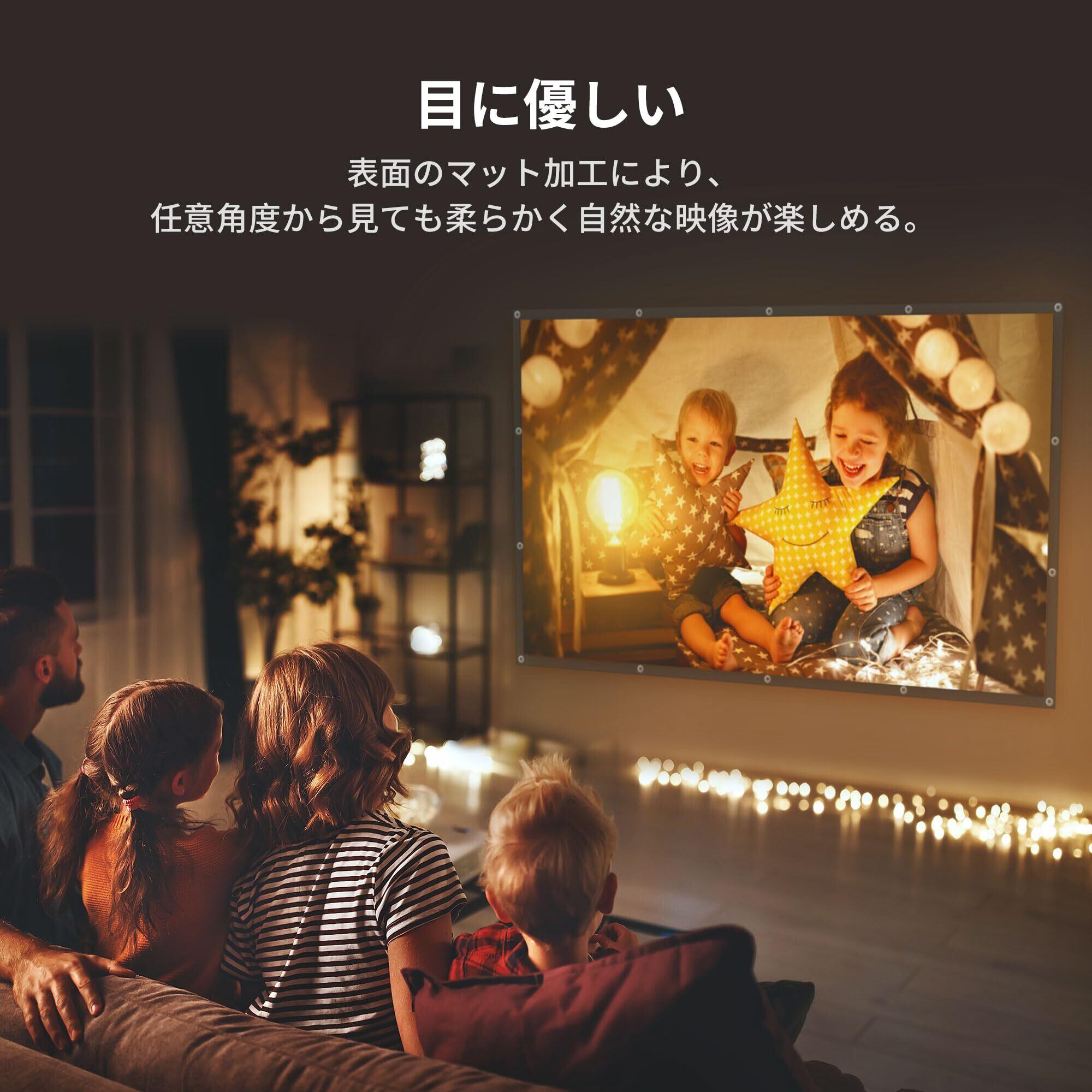 【目に優しい映像と高品質な画面】スクリーン表面にはマット加工が施され、プロジェクターの光を均一に拡散させます。これにより、どの角度からでも自然でソフトな映像が得られ、長時間の鑑賞でも目に負担をかけません。