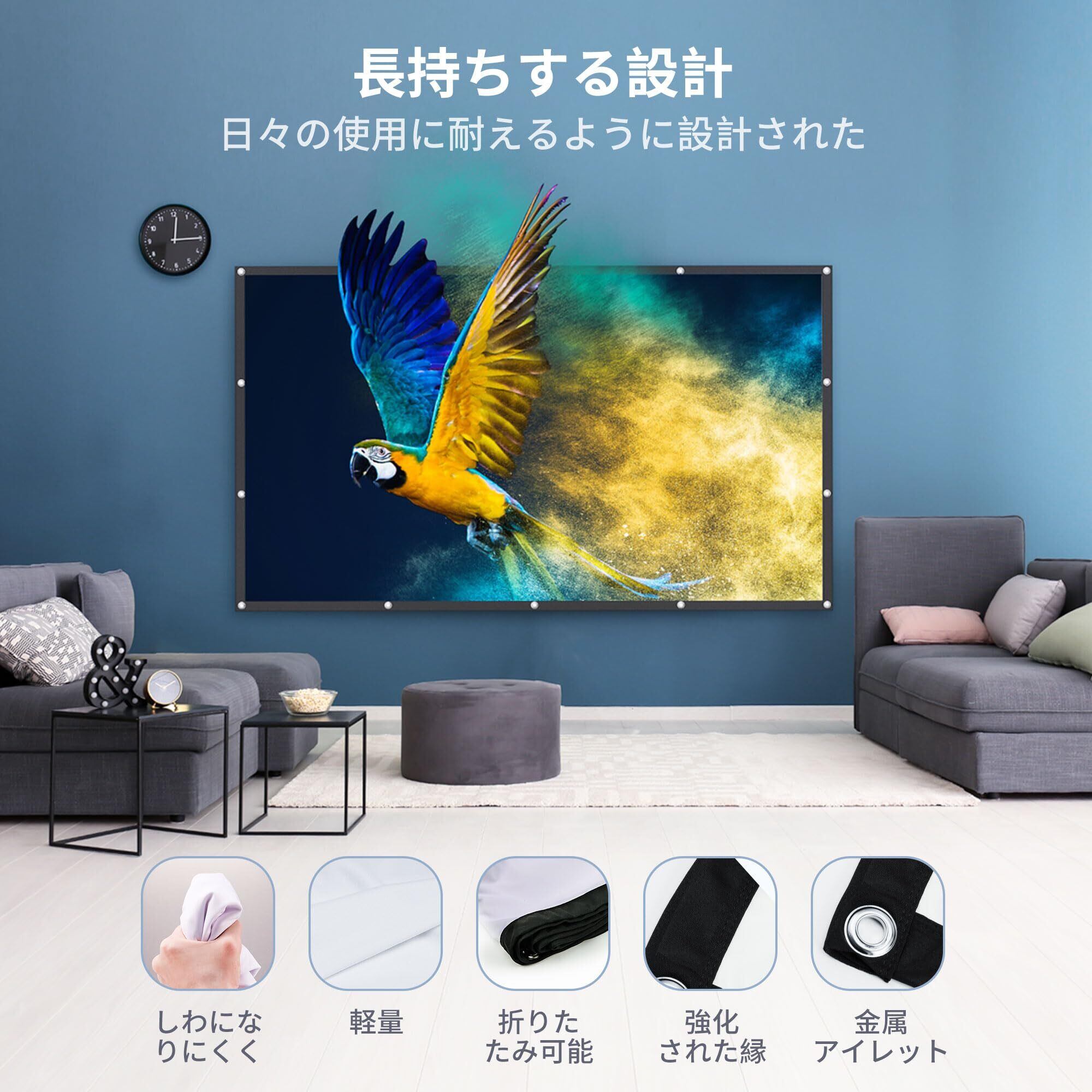 【折り畳み式&商品仕様】このホームシアタースクリーンは、折り畳み式で収納に便利で、アウトドアでの利用にも適しています。対角線サイズ100インチ(視野サイズ:225cm x 128cm)、アスペクト比16:9を誇り、6~10畳の部屋に最適です。【注意点】ポリエステル素材でシワや型崩れを防ぐ効果があります。シワが付いた場合、衣類スチーマーを使用すればシワが簡単に伸びます(低温)。