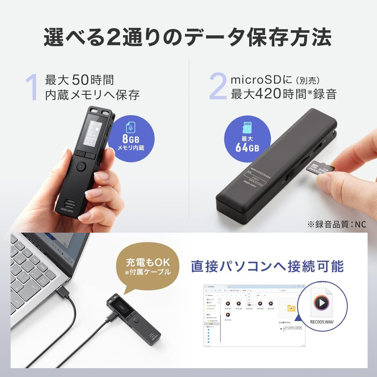 本体に8GBメモリを内蔵し、最大50時間の録音が可能です。(※録音音質:NCの場合)最大64GBまでのmicroSDカード(別売り)への保存も可能で、最大420時間(※64GBの場合)録音も可能です。