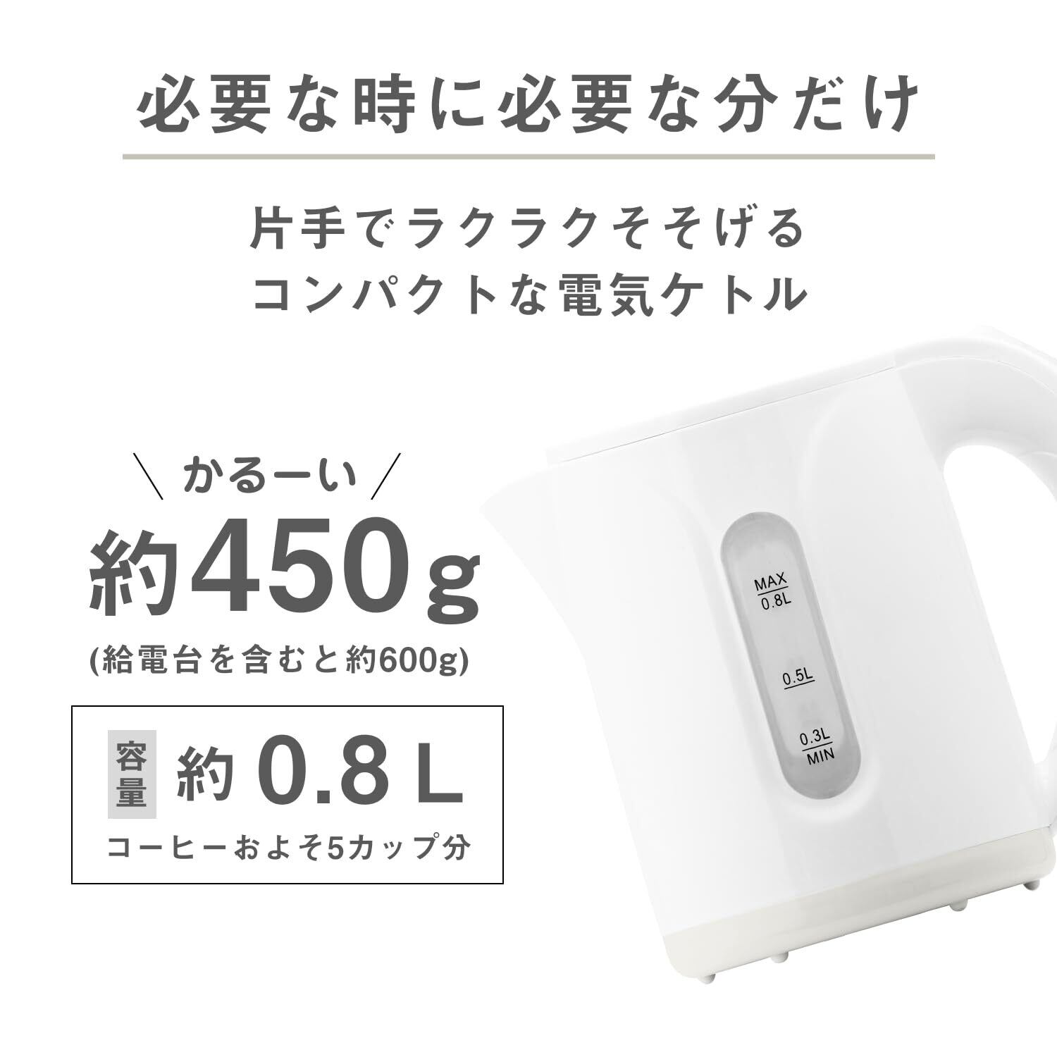 コンパクトで非常に軽い、扱いやすい電気ケトル。